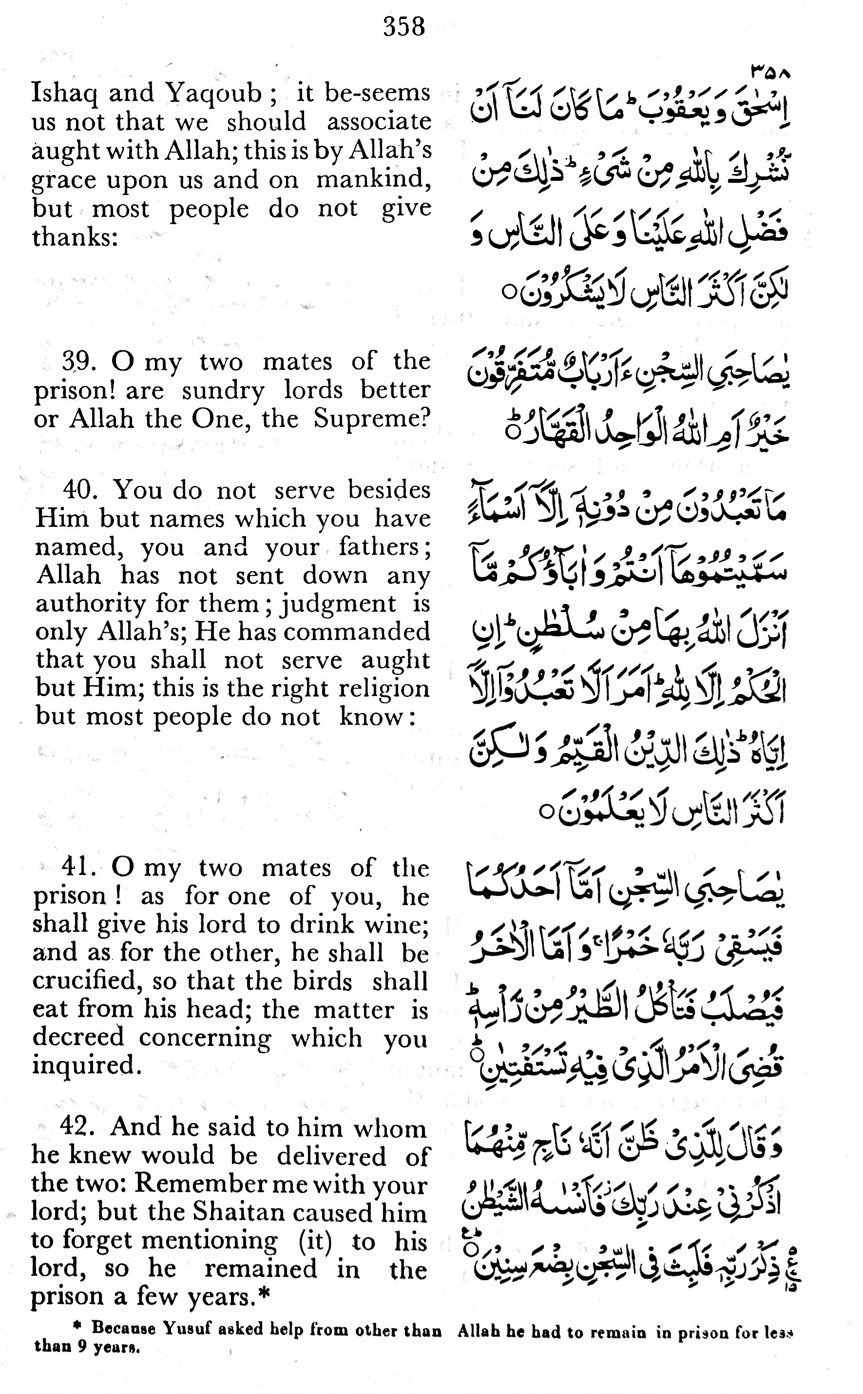 42. And he said to him whom he knew would be delivered of the two: Remember me with your lord; but the Shaitan caused him to forget mentioning (it) to his lord, so he remained in the prison a few years.*