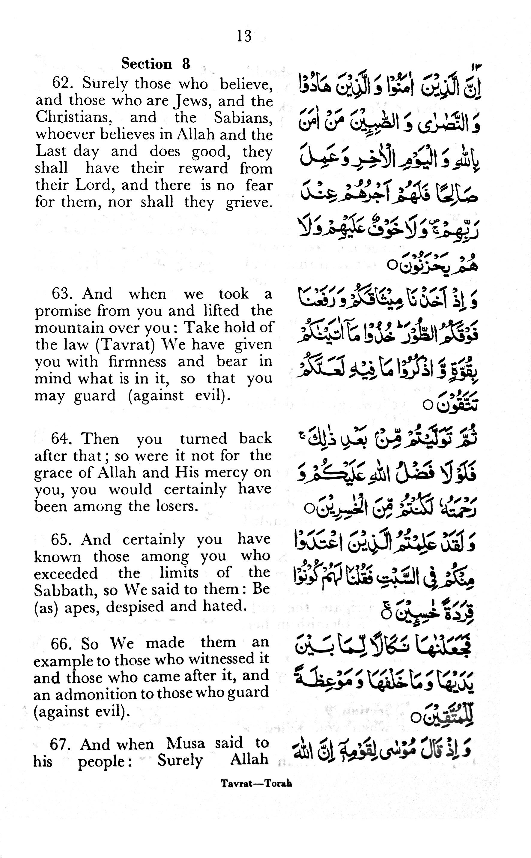 62. Surely those who believe, and those who are Jews, and the Christians, and the Sabians, whoever believes in Allah and the Last day and does good, they shall have their reward from their Lord, and there is no fear for them, nor shall they grieve.
