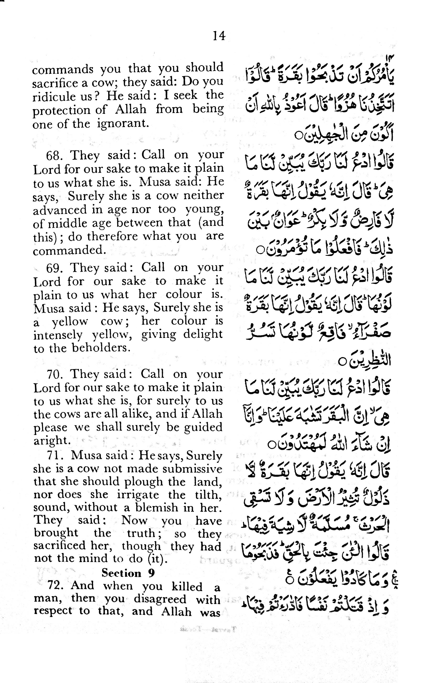 68. They said: Call on your Lord for our sake to make it plain to us what she is. Musa said: He says, Surely she is a cow neither advanced in age nor too young, of middle age between that (and this); do therefore what you are commanded.