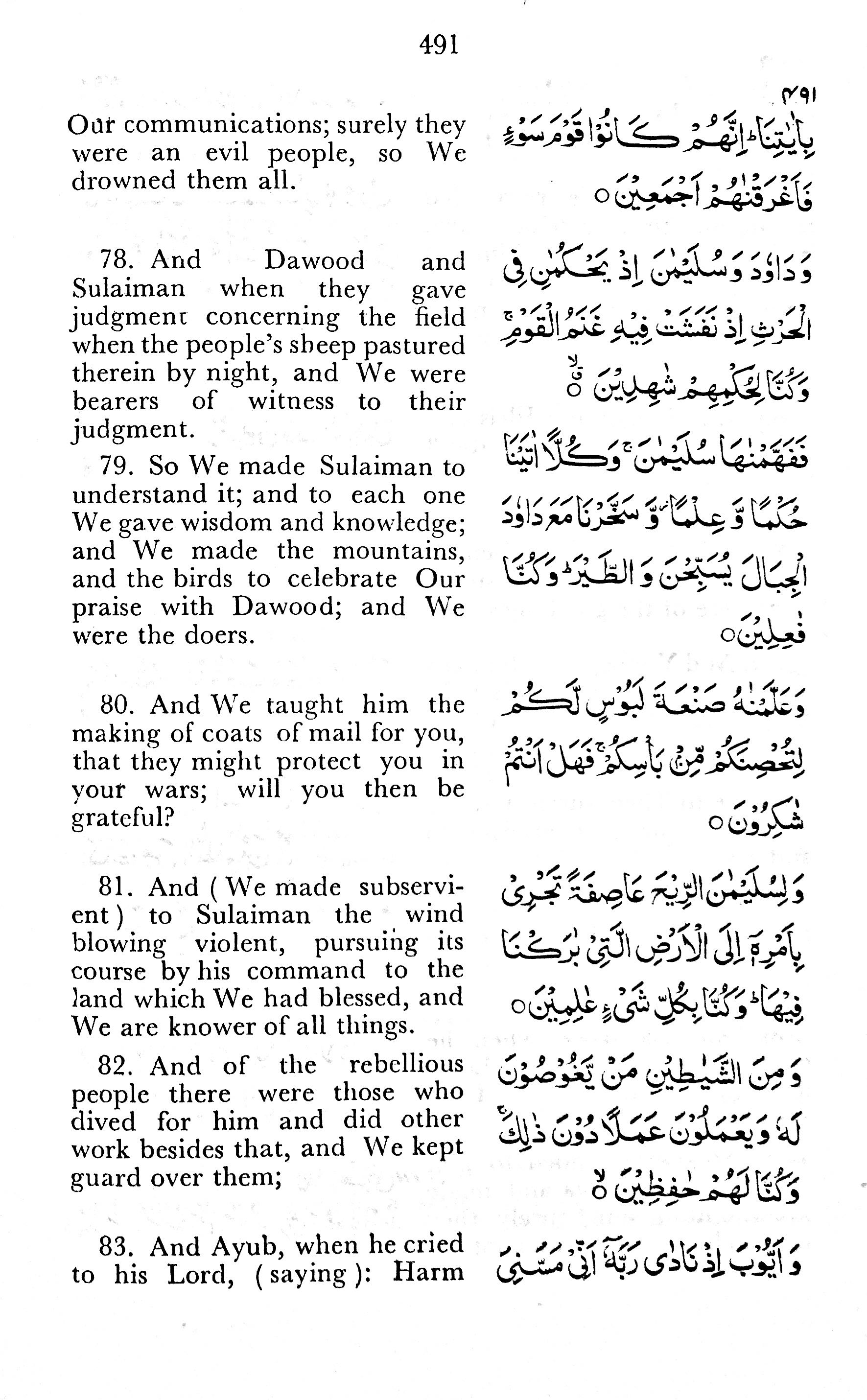 78. And Dawood and Sulaiman when they gave judgment concerning the field when the people’s sheep pastured therein by night, and We were bearers of witness to their judgment.