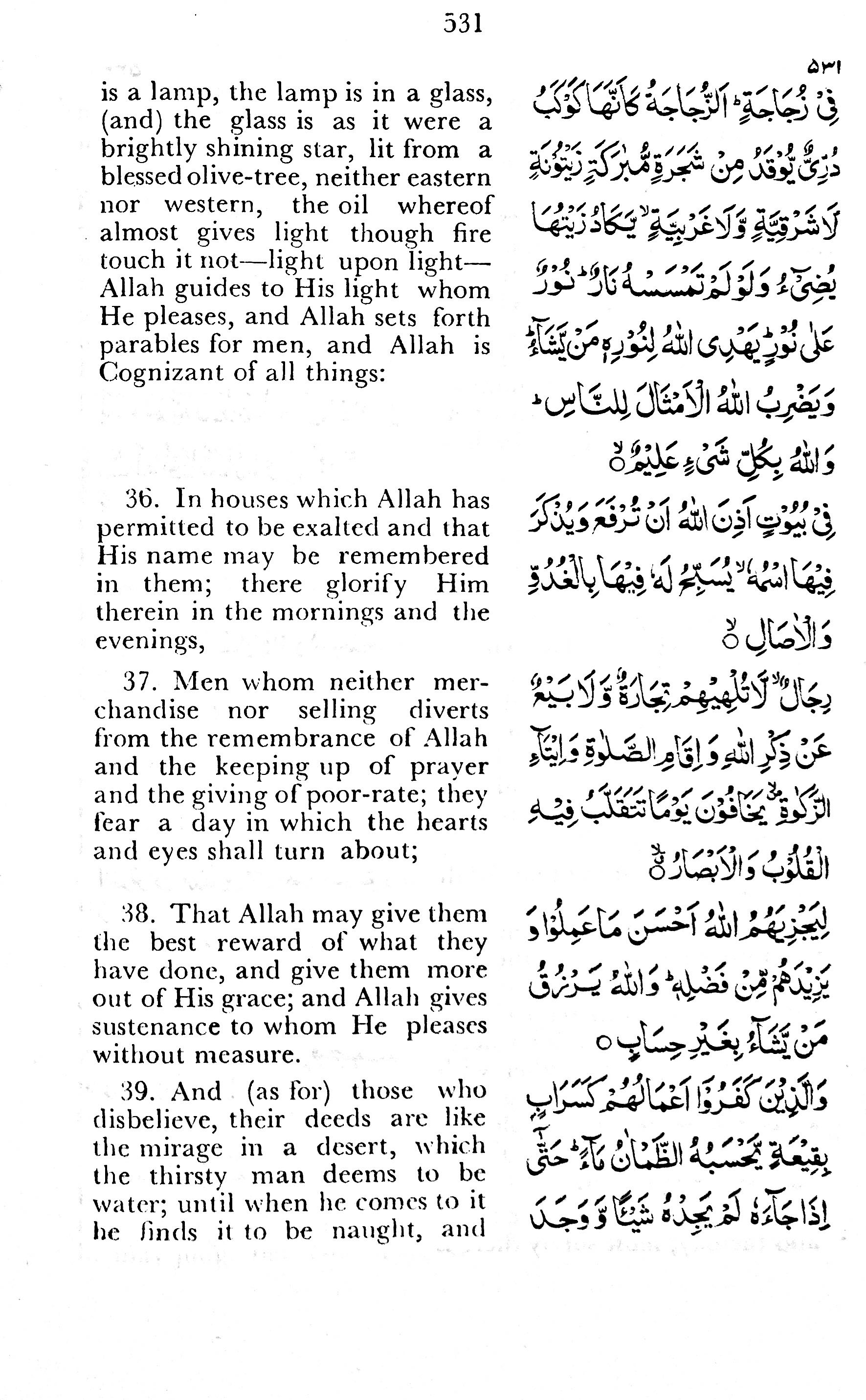 39. And (as for) those who disbelieve, their deeds are like the mirage in a desert, which the thirsty man deems to be water; until when he comes to it he finds it to be naught, and