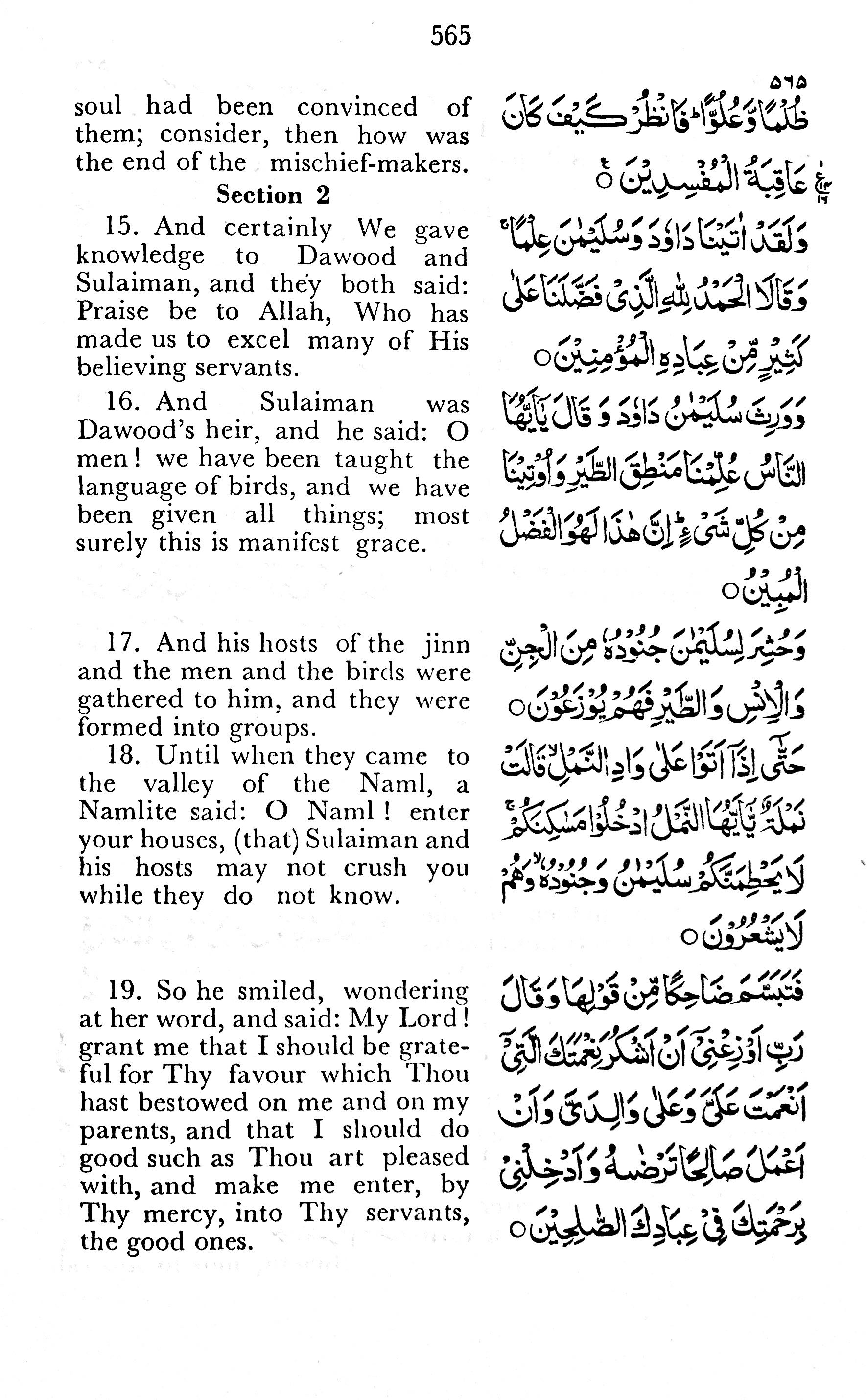 16. And Sulaiman was Dawood’s heir, and he said: O men! we have been taught the language of birds, and we have been given all things; most surely this is manifest grace.
