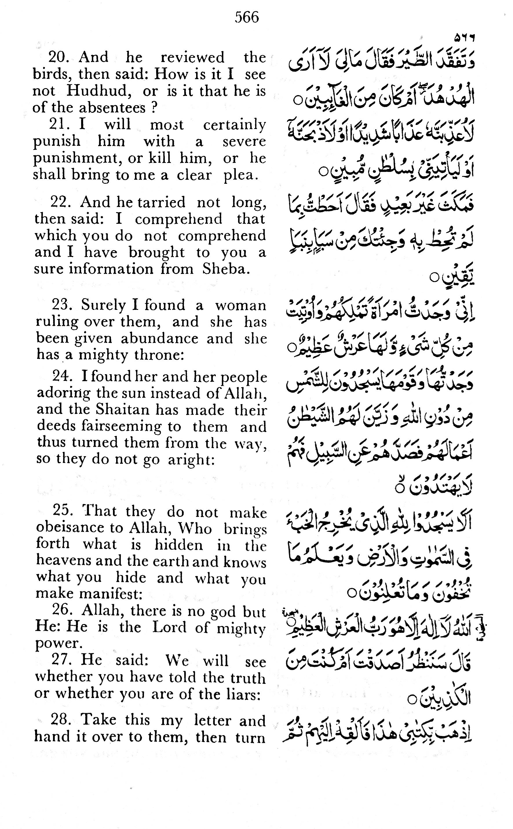 24. I found her and her people adoring the sun instead of Allah, and the Shaitan has made their deeds fairseeming to them and thus turned them from the way, so they do not go aright: