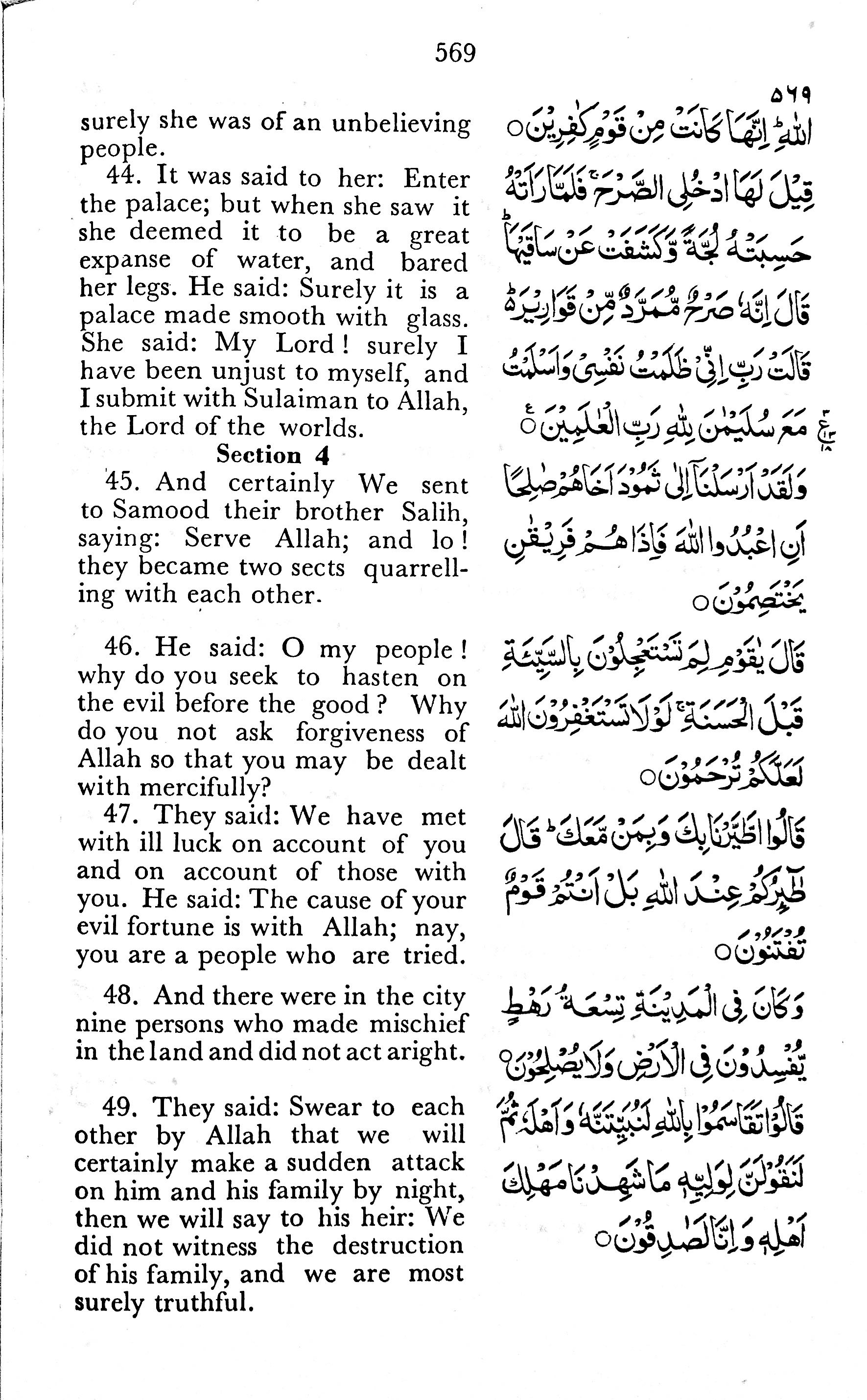 44. It was said to her: Enter the palace; but when she saw it she deemed it to be a great expanse of water, and bared her legs. He said: Surely it is a palace made smooth with glass. She said: My Lord! surely I have been unjust to myself, and I submit with Sulaiman to Allah, the Lord of the worlds.