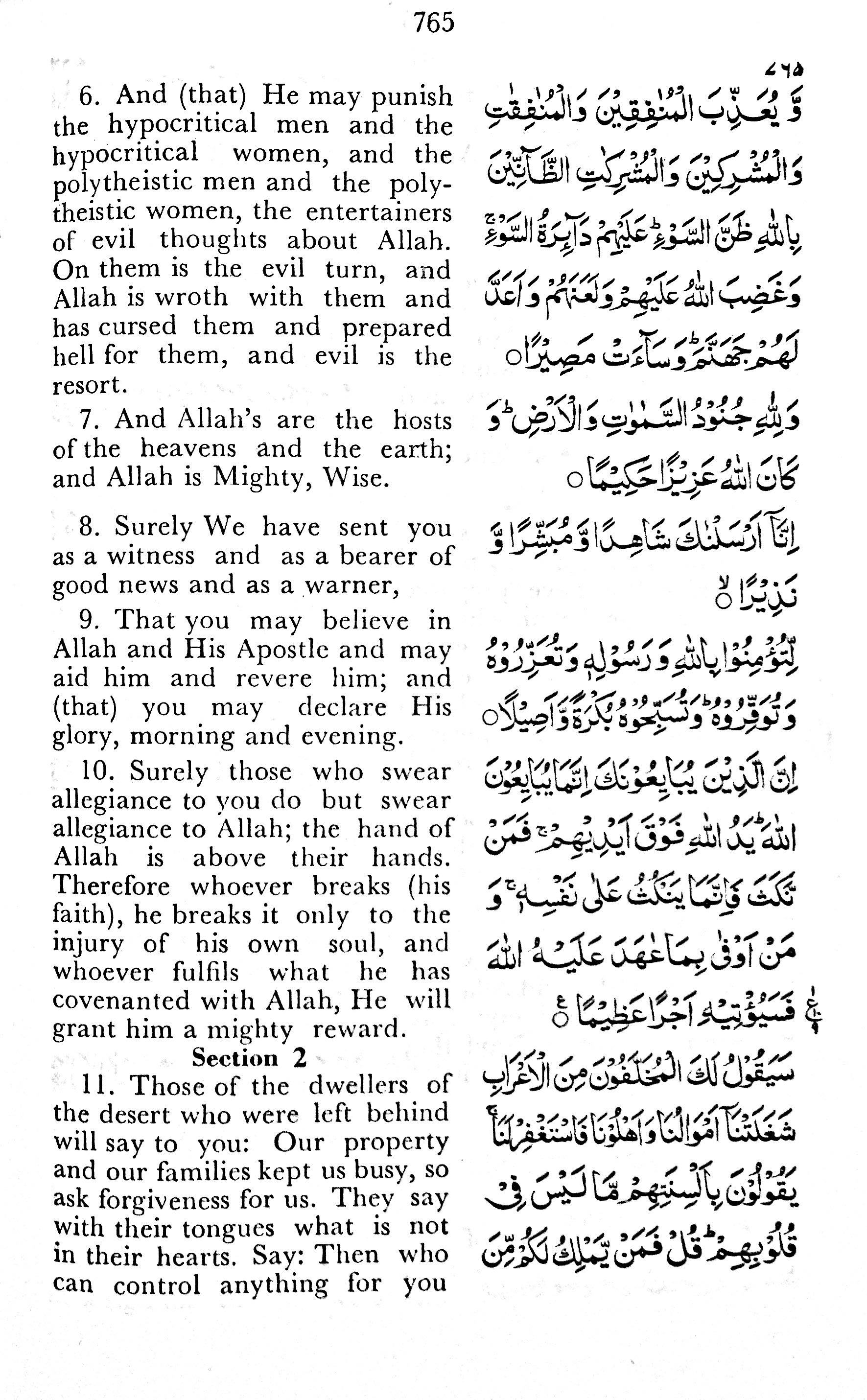 9. That you may believe in Allah and His Apostle and may aid him and revere him; and (that) you may declare His glory, morning and evening.