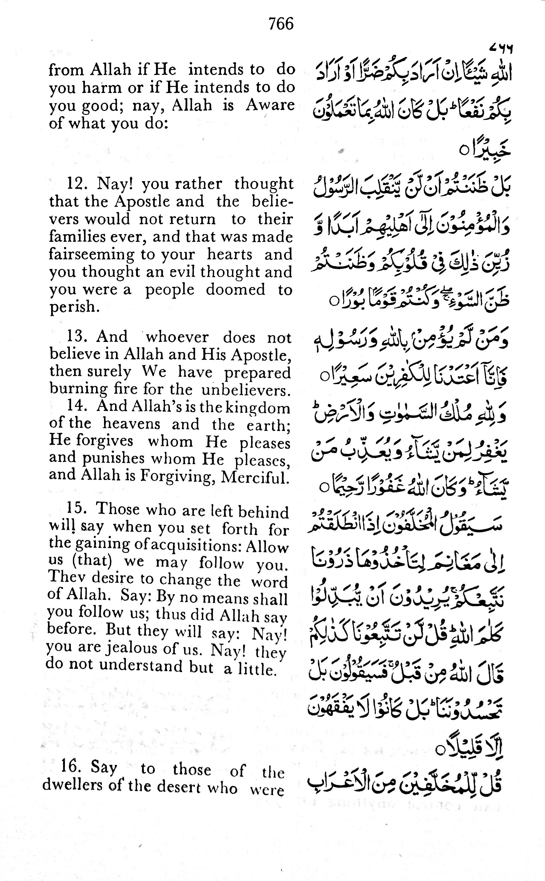 15. Those who are left behind will say when you set forth for the gaining of acquisitions: Allow us (that) we may follow you. They desire to change the word of Allah. Say: By no means shall you follow us; thus did Allah say before. But they will say: Nay! you are jealous of us. Nay! they do not understand but a little.