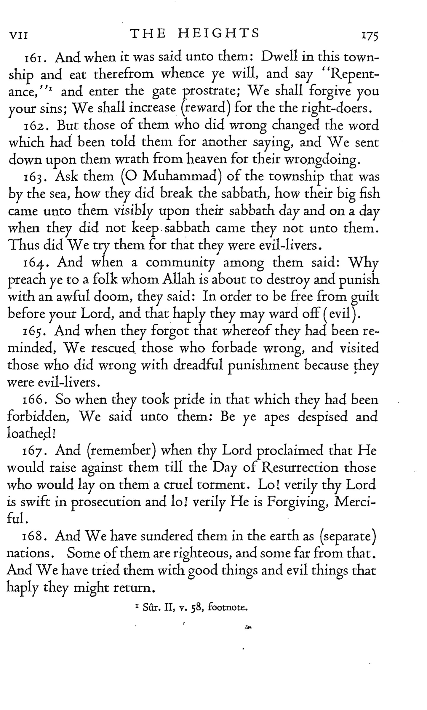 161. And when it was said unto them: Dwell in this township and eat therefrom whence ye will, and say “Repentance,”1 and enter the gate prostrate; We shall forgive you your sins; We shall increase (reward) for the the right-doers.