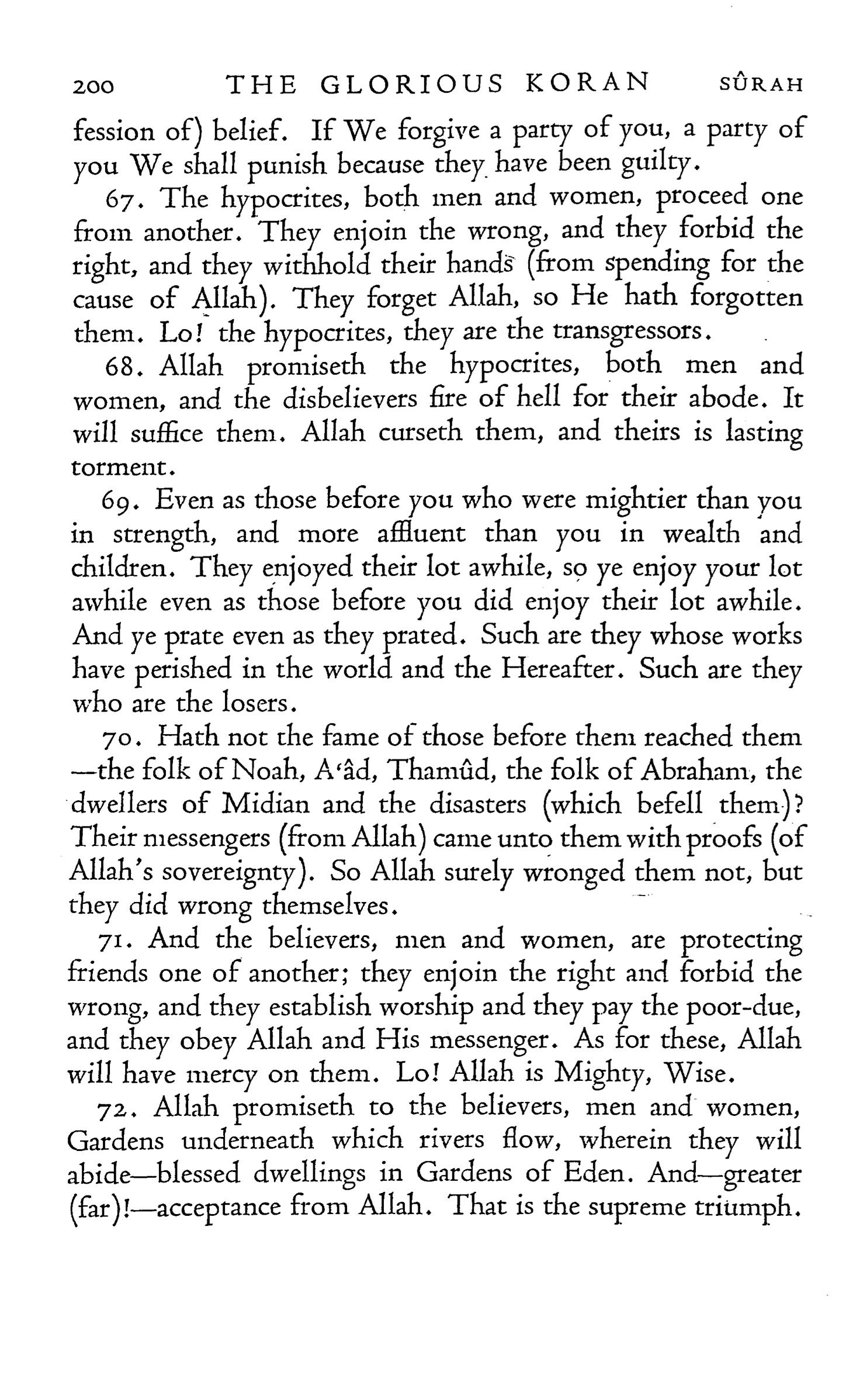 67. The hypocrites, both men and women, proceed one from another. They enjoin the wrong, and they forbid the right, and they withhold their hands (from spending for the cause of Allah). They forget Allah, so He hath forgotten them. Lo! the hypocrites, they are the transgressors.