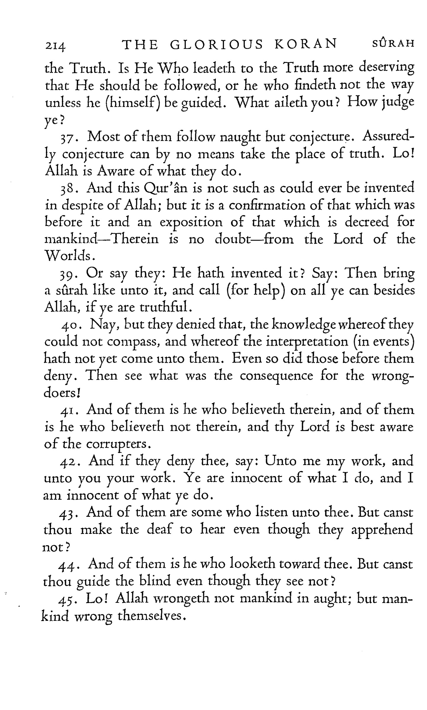 37. Most of them follow naught but conjecture. Assuredly conjecture can by no means take the place of truth. Lo! Allah is Aware of what they do.