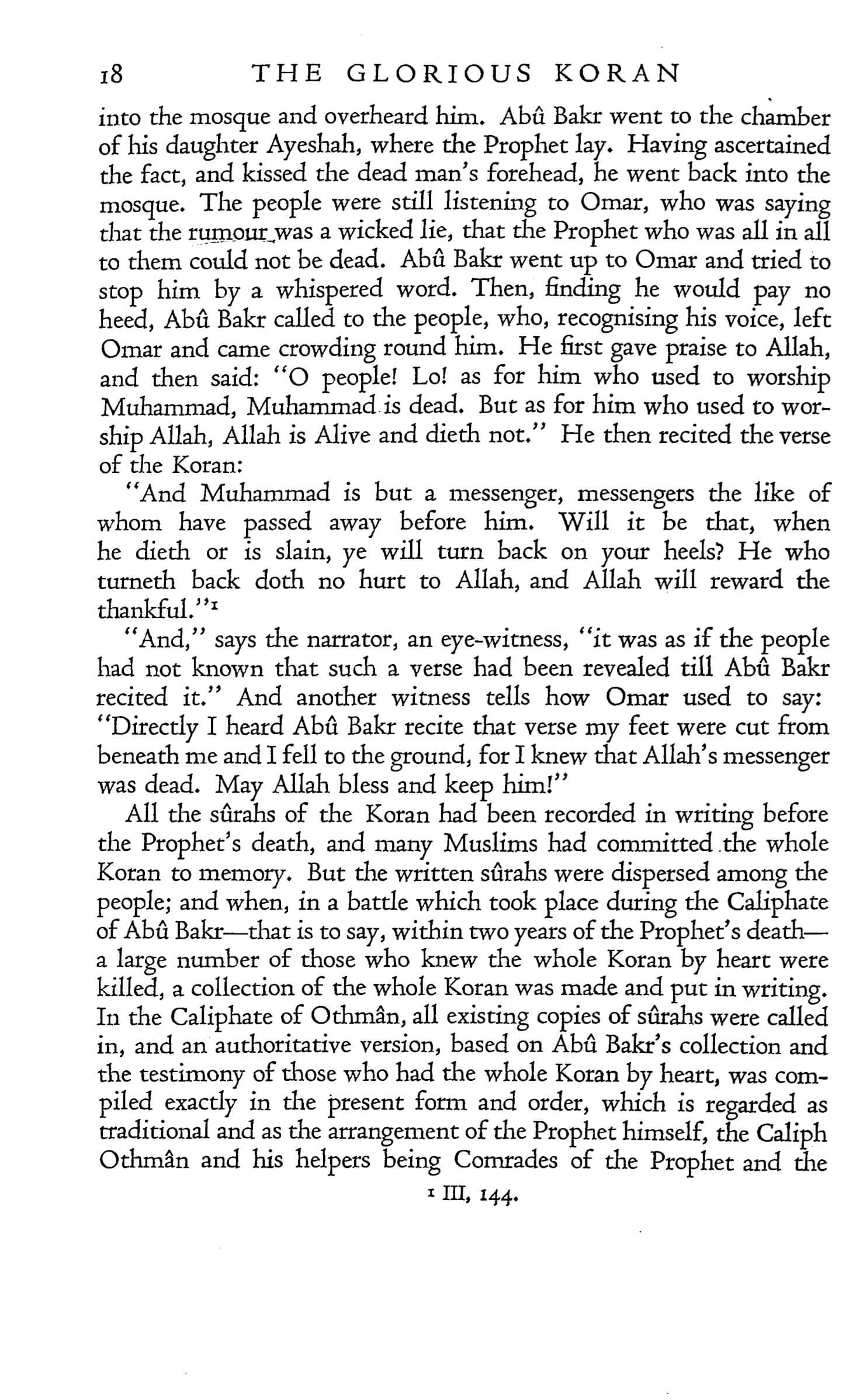 All the sûrahs of the Koran had been recorded in writing before the Prophet’s death, and many Muslims had committed the whole Koran to memory. But the written sûrahs were dispersed among the people; and when, in a battle which took place during the Caliphate of Abû Bakr — that is to say, within two years of the Prophet’s death — a large number of those who knew the whole Koran by heart were killed, a collection of the whole Koran was made and put in writing. In the Caliphate of Othmân, all existing copies of sûrahs were called in, and an authoritative version, based on Abû Bakr’s collection and the testimony of those who had the whole Koran by heart, was compiled exactly in the present form and order, which is regarded as traditional and as the arrangement of the Prophet himself, the Caliph Othmân and his helpers being Comrades of the Prophet and the