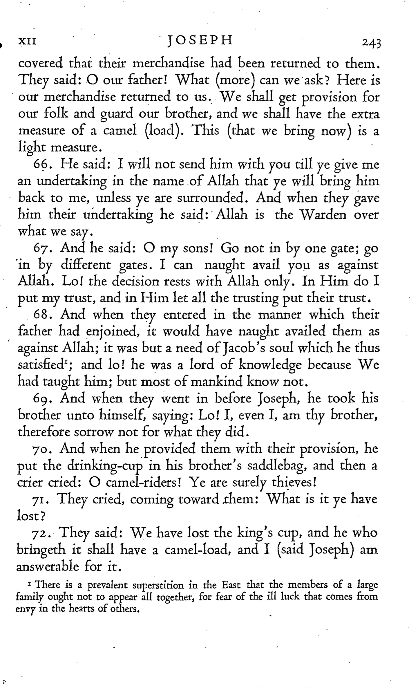 68. And when they entered in the manner which their father had enjoined, it would have naught availed them as against Allah; it was but a need of Jacob’s soul which he thus satisfied 1; and lo! he was a lord of knowledge because We had taught him; but most of mankind know not.