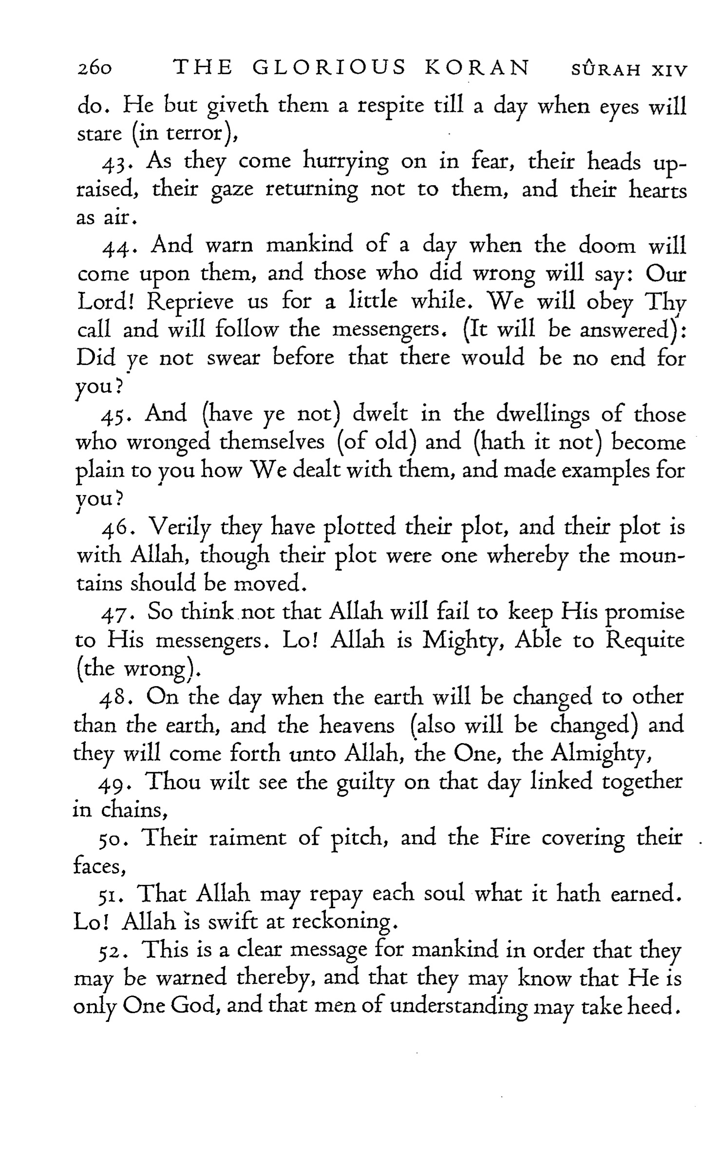 44. And warn mankind of a day when the doom will come upon them, and those who did wrong will say: Our Lord! Reprieve us for a little while. We will obey Thy call and will follow the messengers, (It will be answered): Did ye not swear before that there would be no end for you?