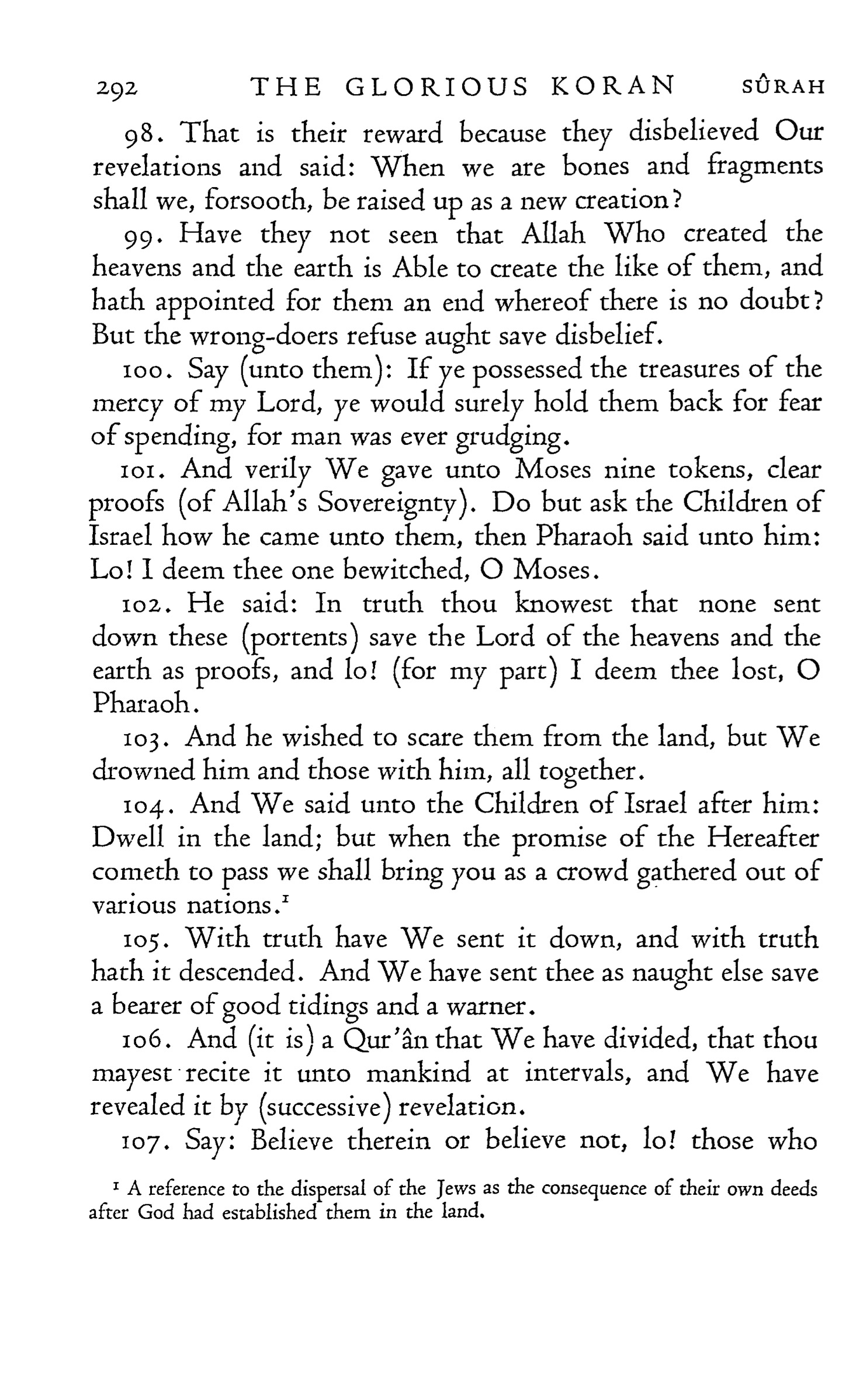 104. And We said unto the Children of Israel after him: Dwell in the land; but when the promise of the Hereafter cometh to pass we shall bring you as a crowd gathered out of various nations.1