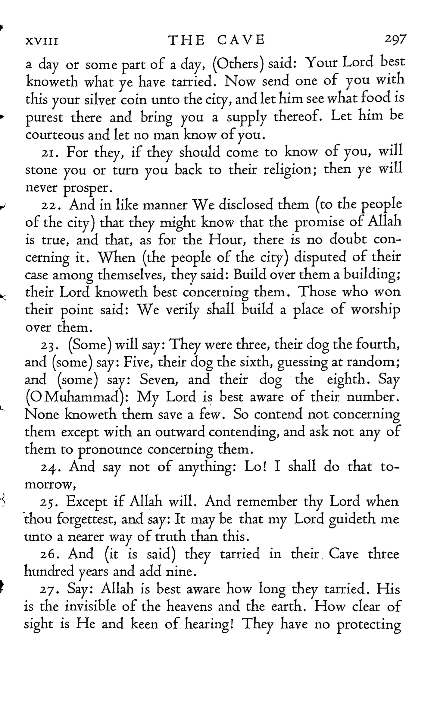 23. (Some) will say: They were three, their dog the fourth, and (some) say: Five, their dog the sixth, guessing at random; and (some) say: Seven, and their dog the eighth. Say (O Muhammad): My Lord is best aware of their number. None knoweth them save a few. So contend not concerning them except with an outward contending, and ask not any of them to pronounce concerning them.