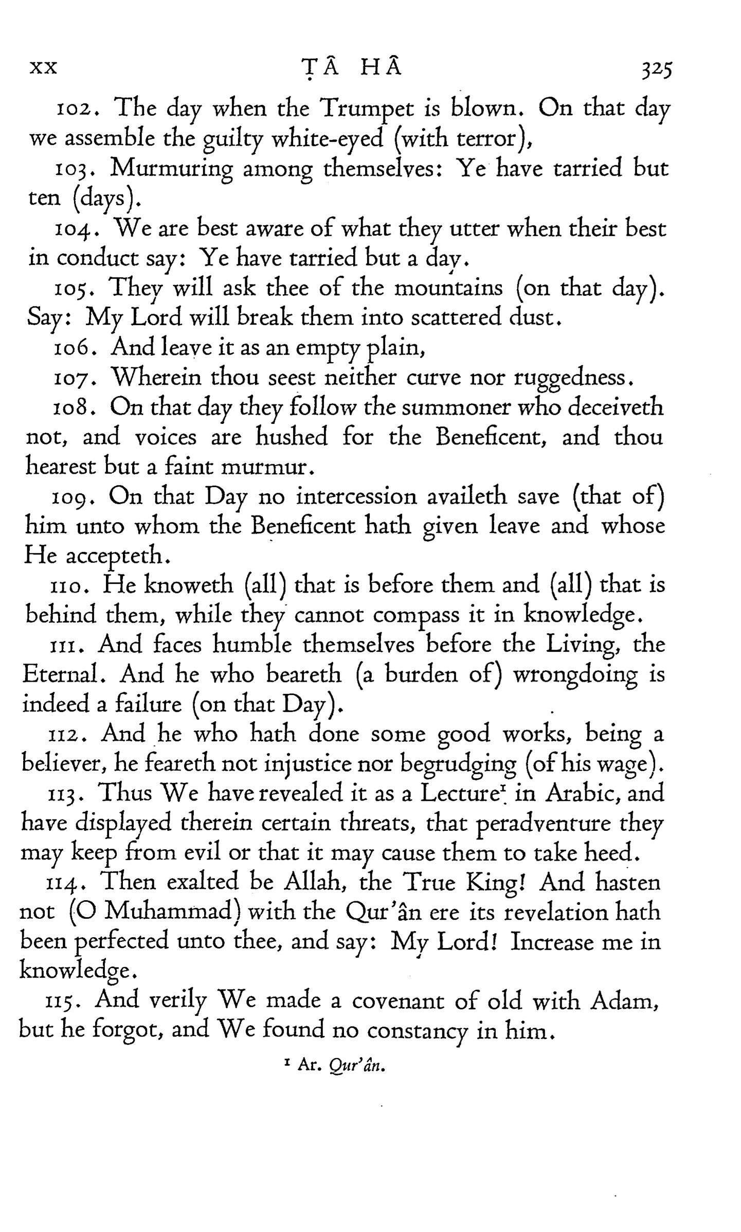 111. And faces humble themselves before the Living, the Eternal. And he who beareth (a burden of) wrongdoing is indeed a failure (on that Day).