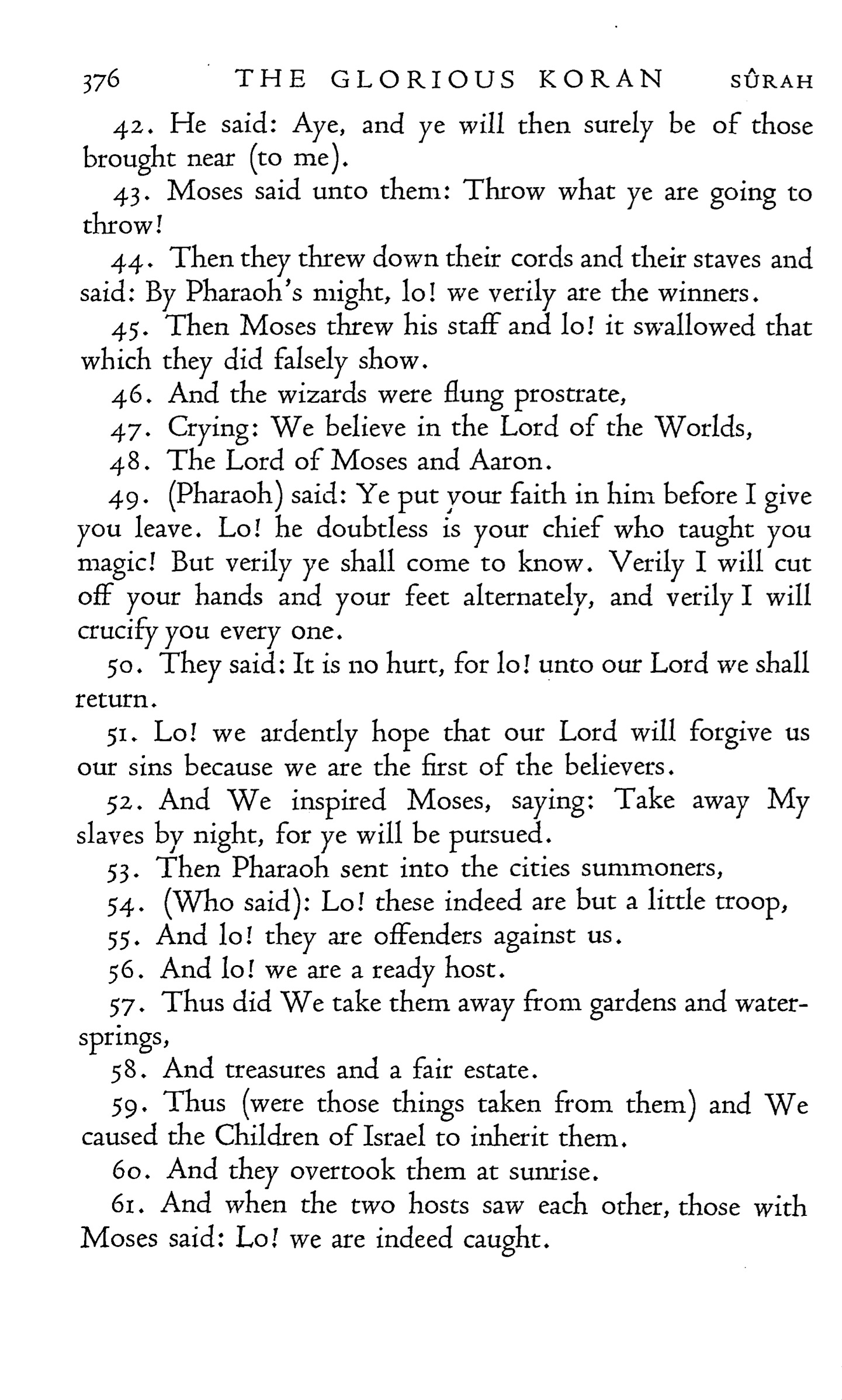 44. Then they threw down their cords and their staves and said: By Pharaoh’s might, lo! we verily are the winners.
