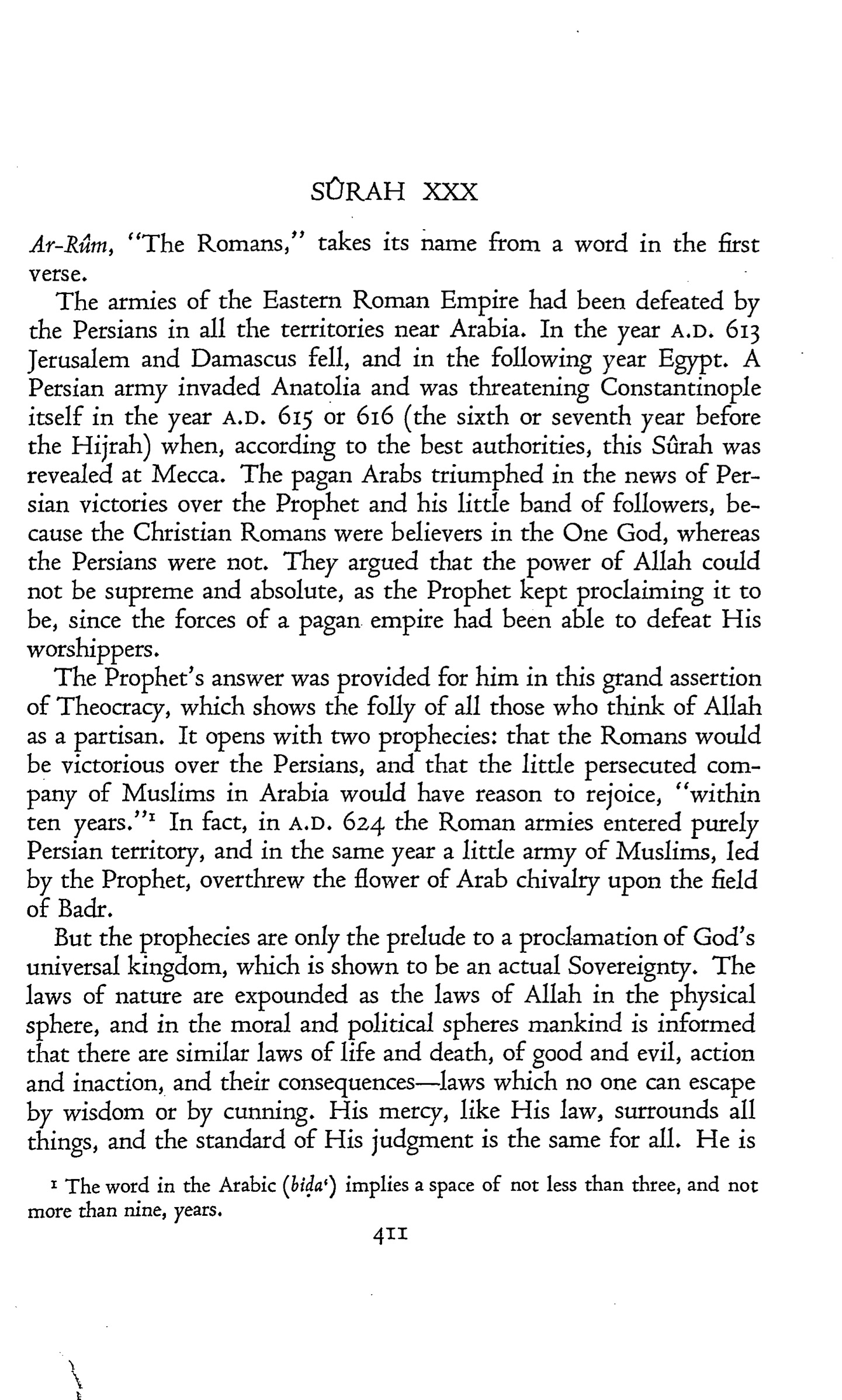 The armies of the Eastern Roman Empire had been defeated by the Persians in all the territories near Arabia. In the year A.D. 613 Jerusalem and Damascus fell, and in the following year Egypt. A Persian army invaded Anatolia and was threatening Constantinople itself in the year A.D. 615 or 616 (the sixth or seventh year before the Hijrah) when, according to the best authorities, this Sûrah was revealed at Mecca. The pagan Arabs triumphed in the news of Persian victories over the Prophet and his little band of followers, because the Christian Romans were believers in the One God, whereas the Persians were not. They argued that the power of Allah could not be supreme and absolute, as the Prophet kept proclaiming it to be, since the forces of a pagan empire had been able to defeat His worshippers.