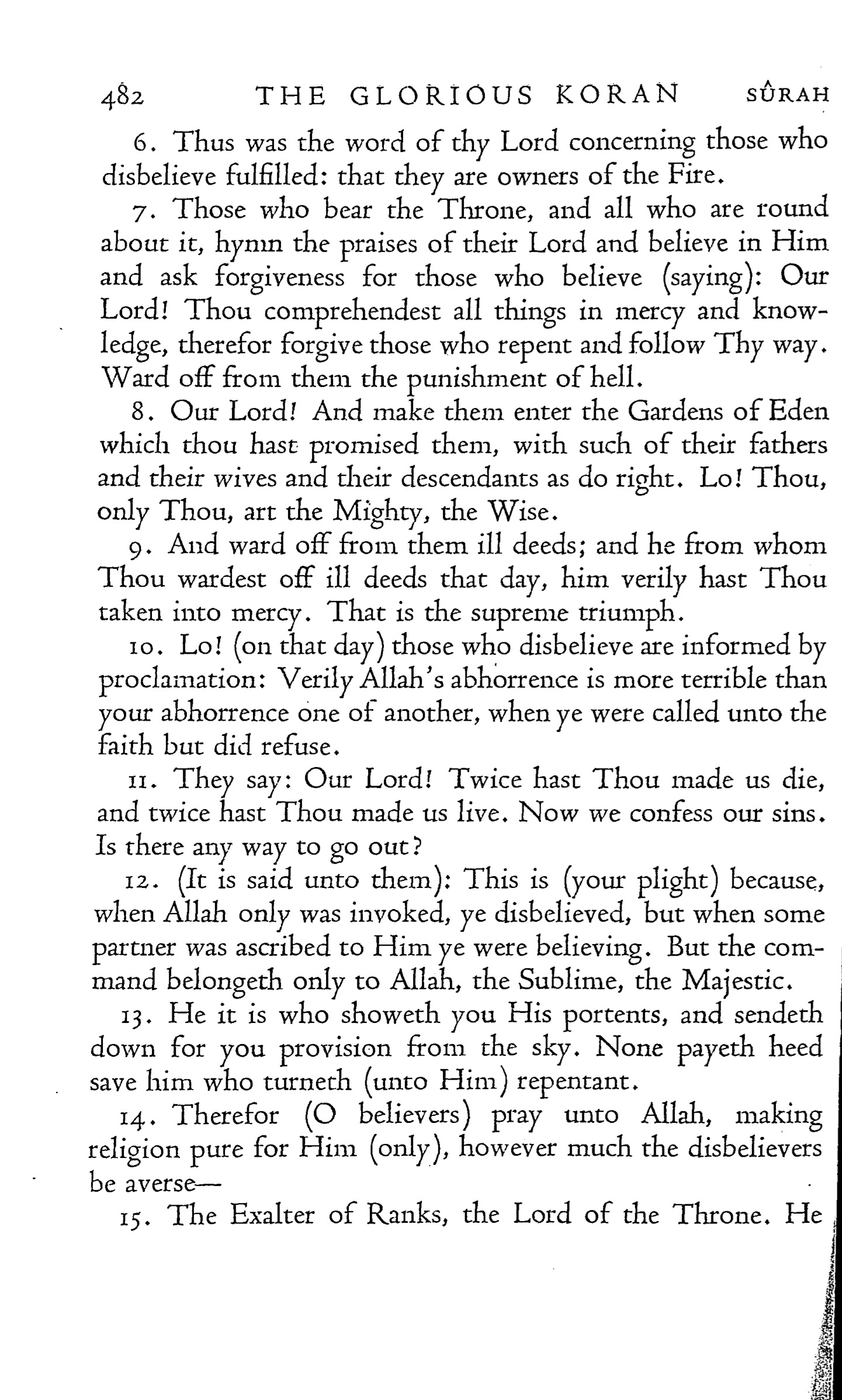 7. Those who bear the Throne, and all who are round about it, hynin the praises of their Lord and believe in Him and ask forgiveness for those who believe (saying): Our Lord! Thou comprehendest all things in mercy and knowledge, therefor forgive those who repent and follow Thy way. Ward off from them the punishment of hell.