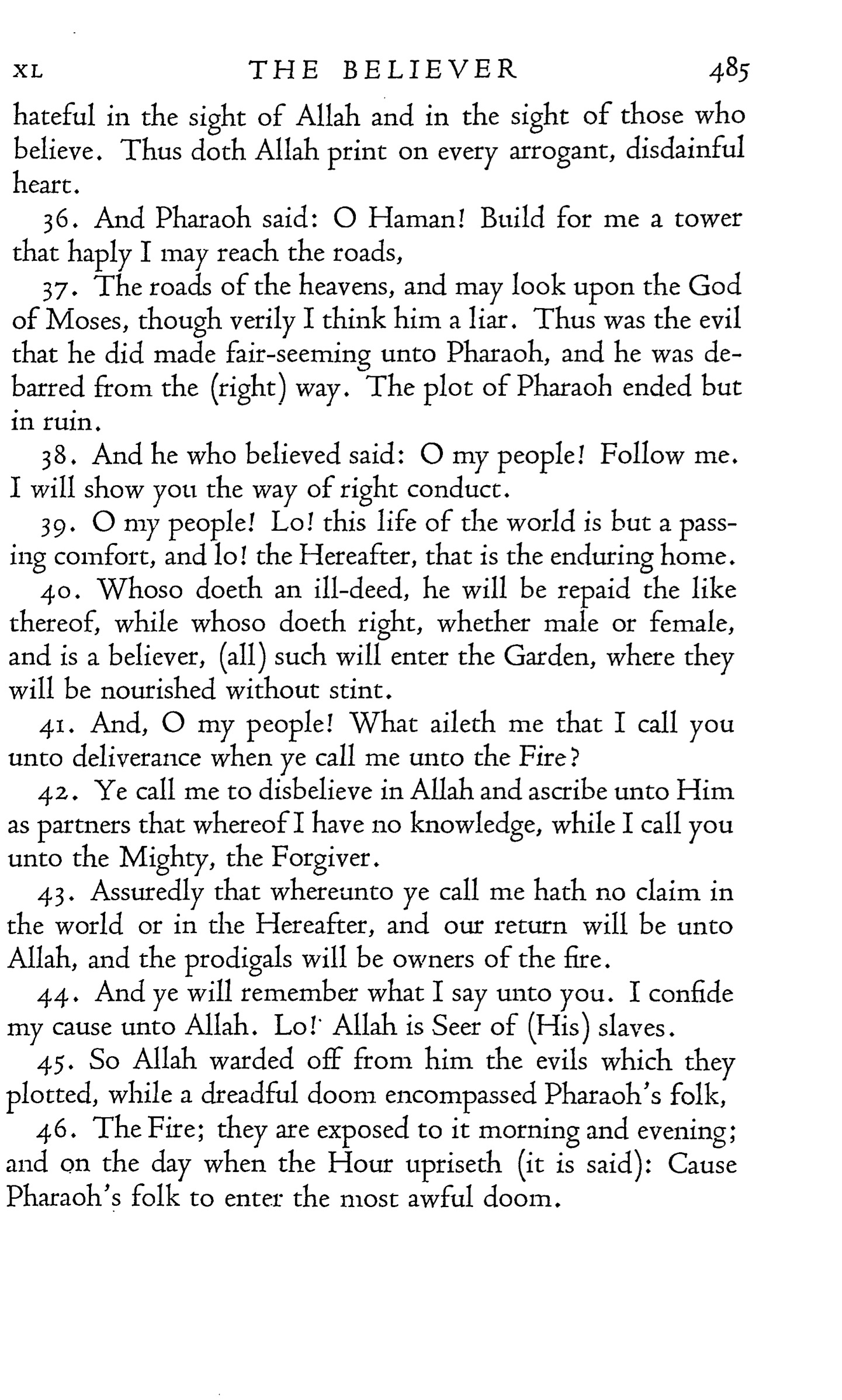 37. The roads of the heavens, and may look upon the God of Moses, though verily I think him a liar. Thus was the evil that he did made fair-seeming unto Pharaoh, and he was debarred from the (right) way. The plot of Pharaoh ended but in ruin.