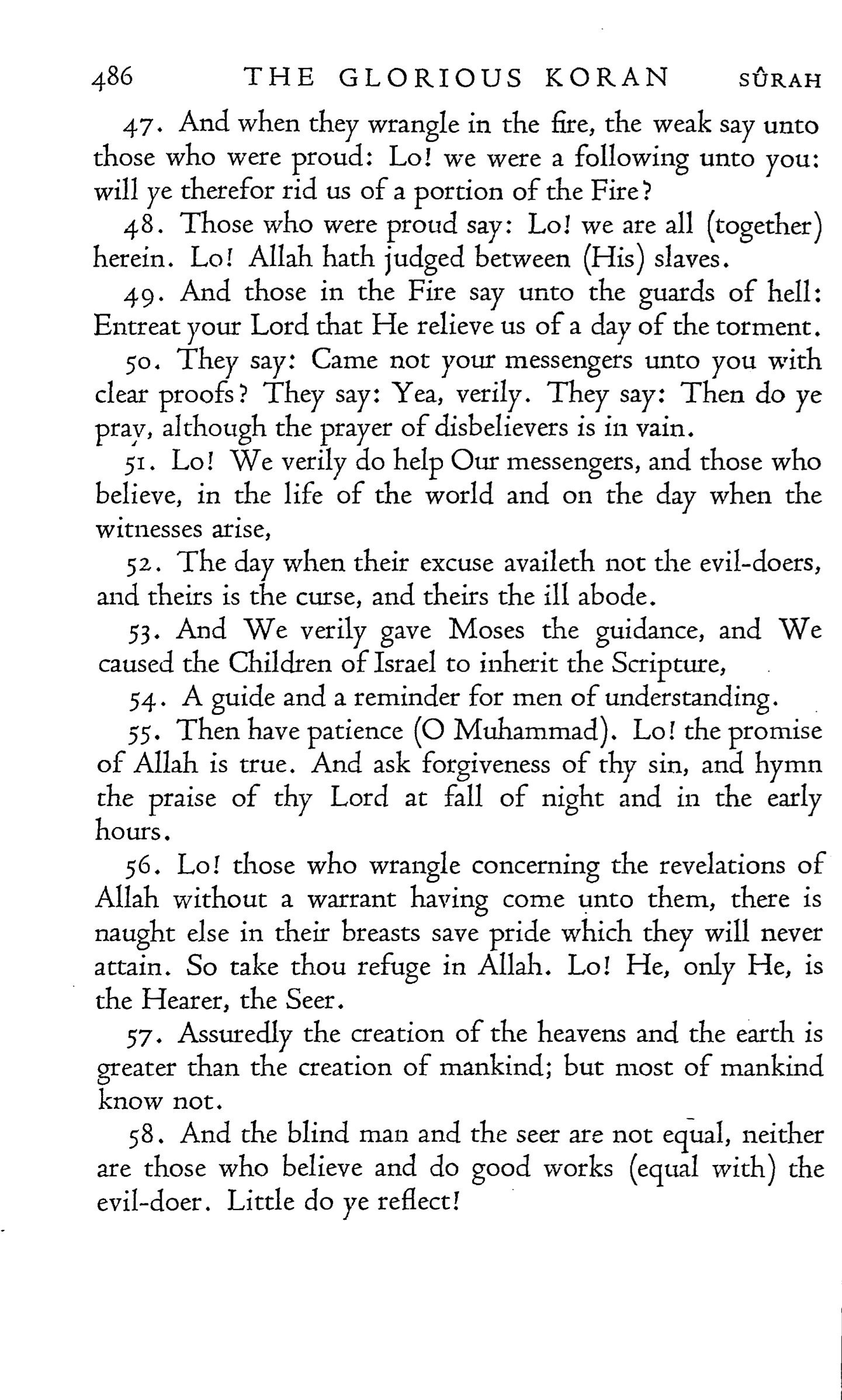 48. Those who were proud say: Lo! we are all (together) herein. Lo! Allah hath judged between (His) slaves.