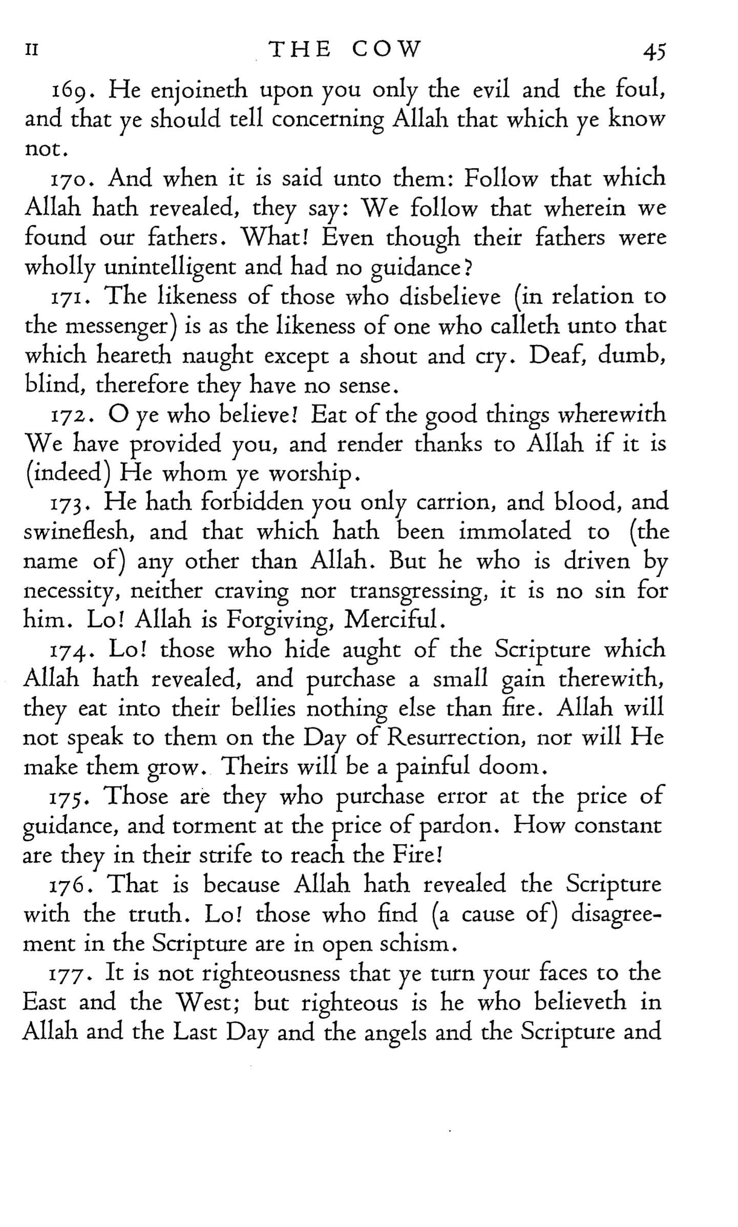177. It is not righteousness that ye turn your faces to the East and the West; but righteous is he who believeth in Allah and the Last Day and the angels and the Scripture and