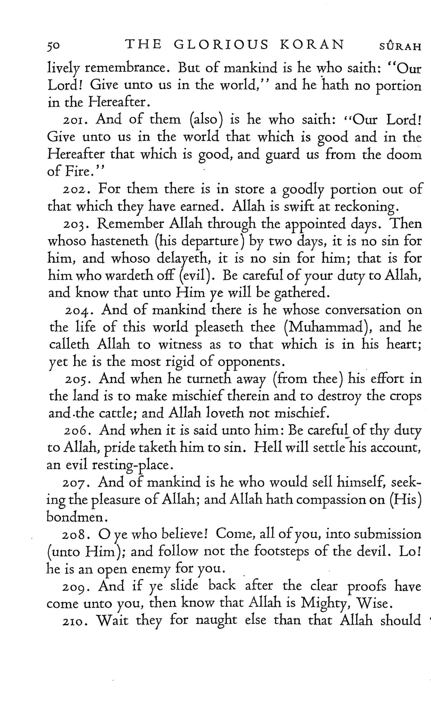 208. O ye who believe! Come, alsl of you, into submission (unto Him); and follow not the footsteps of the devil. Lo! he is an open enemy for you.