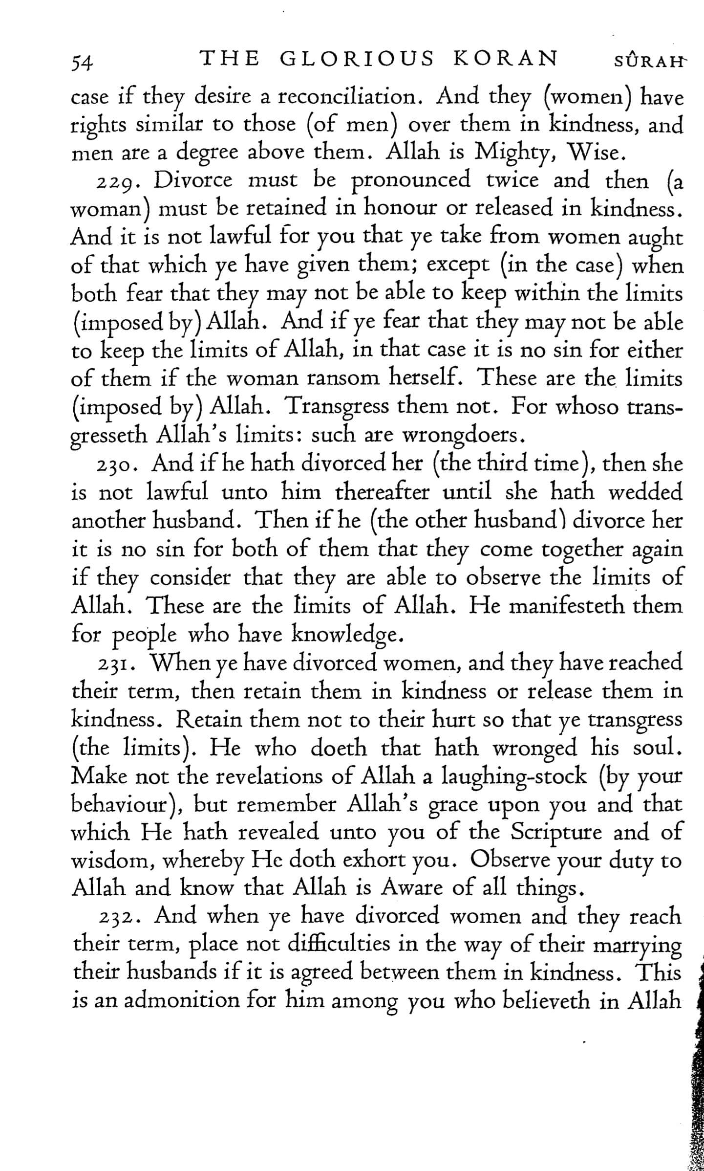 231. When ye have divorced women, and they have reached their term, then retain them in kindness or release them in kindness. Retain them not to their hurt so that ye transgress (the limits). He who doeth that hath wronged his soul. Make not the revelations of Allah a laughing-stock (by your behaviour), but remember Allah’s grace upon you and that which He hath revealed unto you of the Scripture and of wisdom, whereby He doth exhort you. Observe your duty to Allah and know that Allah is Aware of all things.
