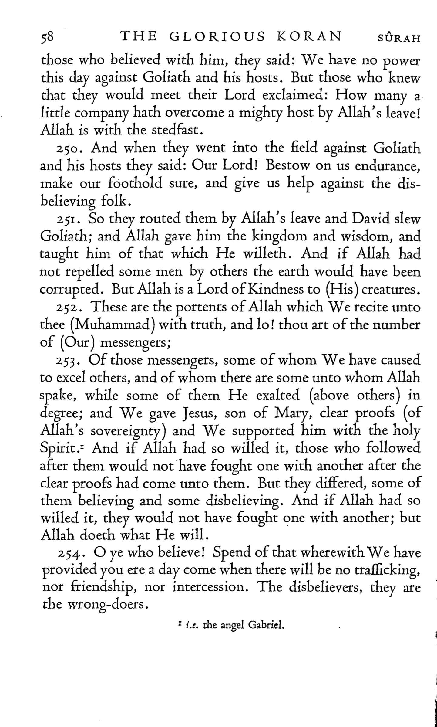 250. And when they went into the field against Goliath and his hosts they said: Our Lord! Bestow on us endurance, make our foothold sure, and give us help against the disbelieving folk.