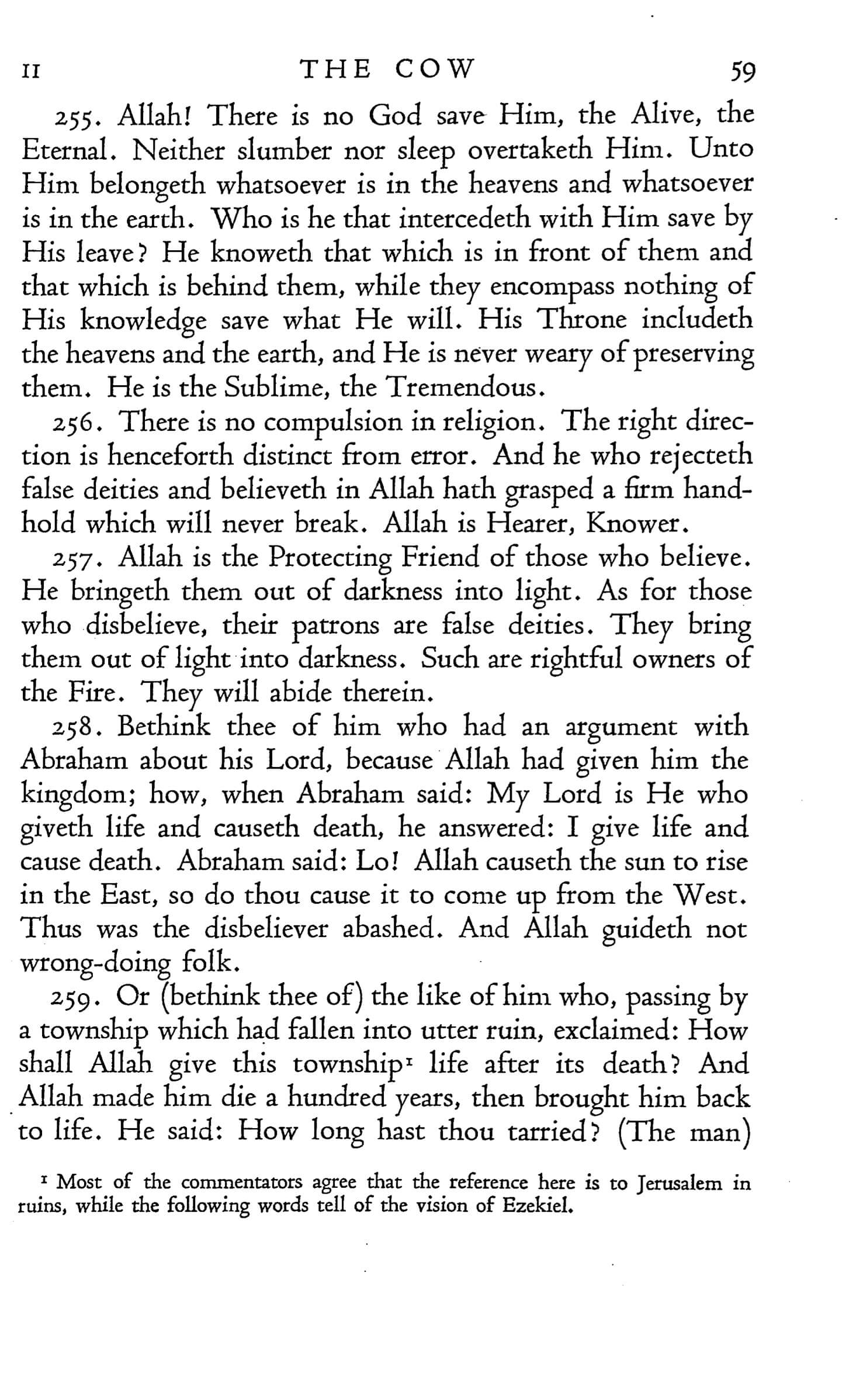 259. Or (bethink thee of) the like of him who, passing by a township which had fallen into utter ruin, exclaimed: How shall Allah give this township 1 life after its death? And Allah made him die a hundred years, then brought him back to life. He said: How long hast thou tarried? (The man)