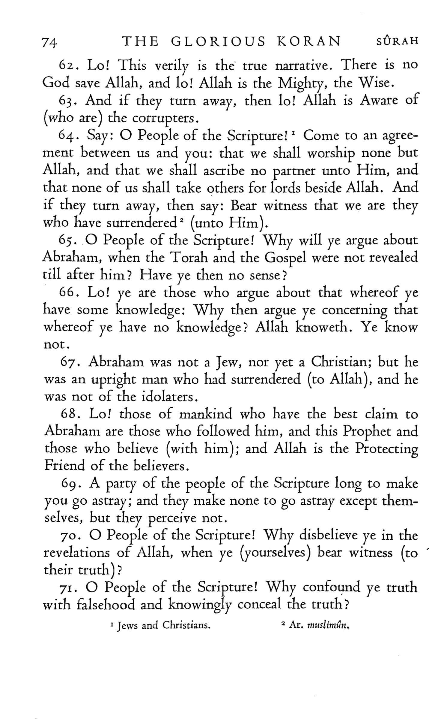 64. Say: O People of the Scripture!1 Come to an agreement between us and you: that we shall worship none but Allah, and that we shall ascribe no partner unto Him, and that none of us shall take others for lords beside Allah. And if they turn away, then say: Bear witness that we are they who have surrendered 2 (unto Him).