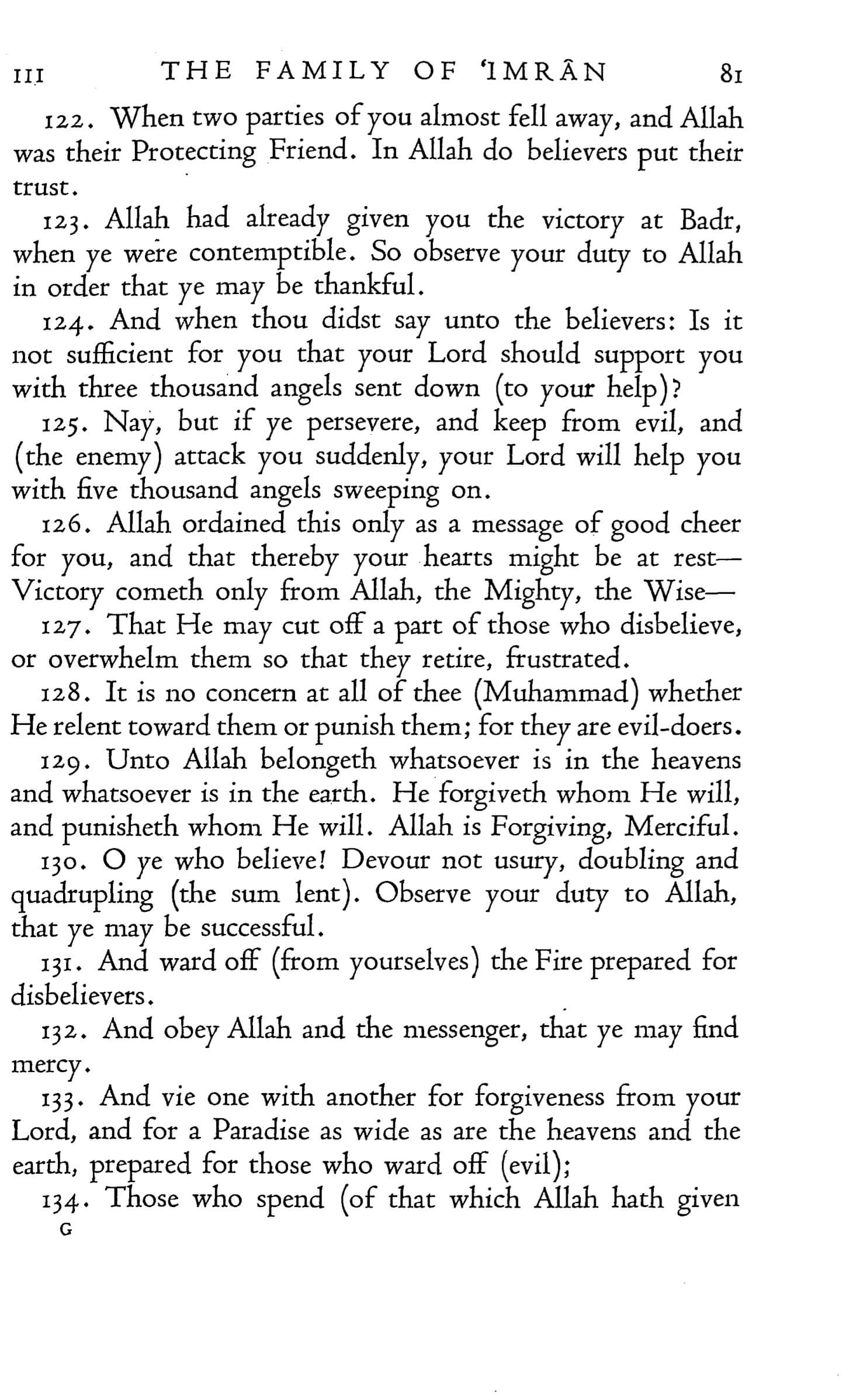 123. Allah had already given you the victory at Badr, when ye were contemptible. So observe your duty to Allah in order that ye may be thankful.