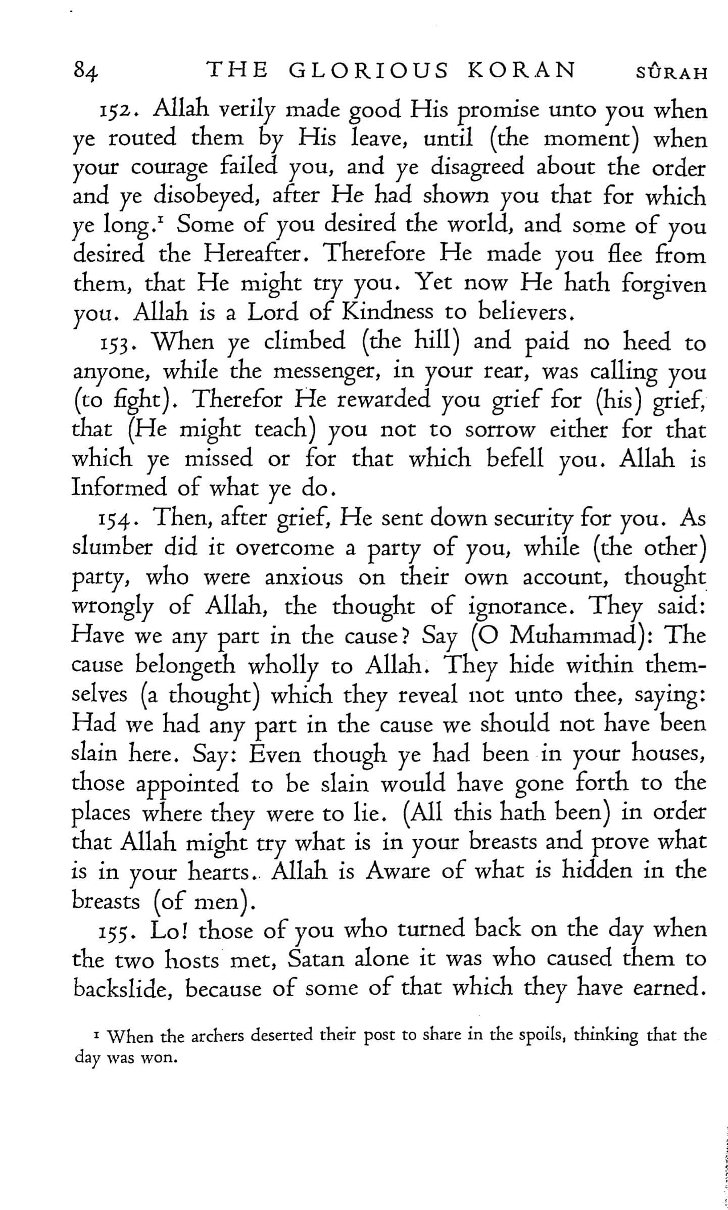 152. Allah verily made good His promise unto you when ye routed them by His leave, until (the moment) when your courage failed you, and ye disagreed about the order and ye disobeyed, after He had shown you that for which ye long.1 Some of you desired the world, and some of you desired the Hereafter. Therefore He made you flee from them, that He might try you. Yet now He hath forgiven you. Allah is a Lord of Kindness to believers.