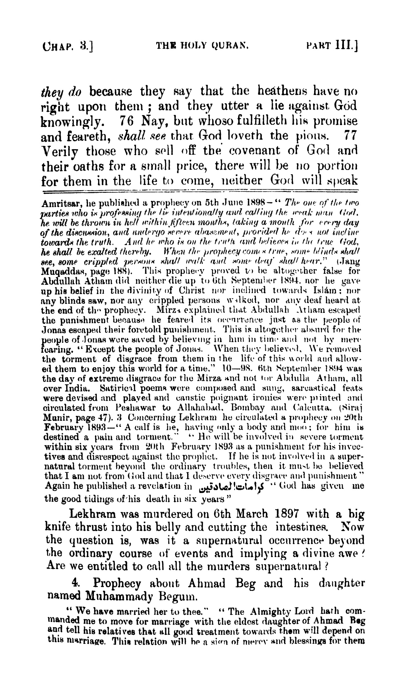 Mohammad Khan, The Holy Qurán. With Short Notes. Based on the Holy Quran, or the Authentic Traditions of the Prophet, or the Old and New Testaments or Scientifics Truths. All fictitious romance, questionable history, and disputed theories have been carefully avoided,