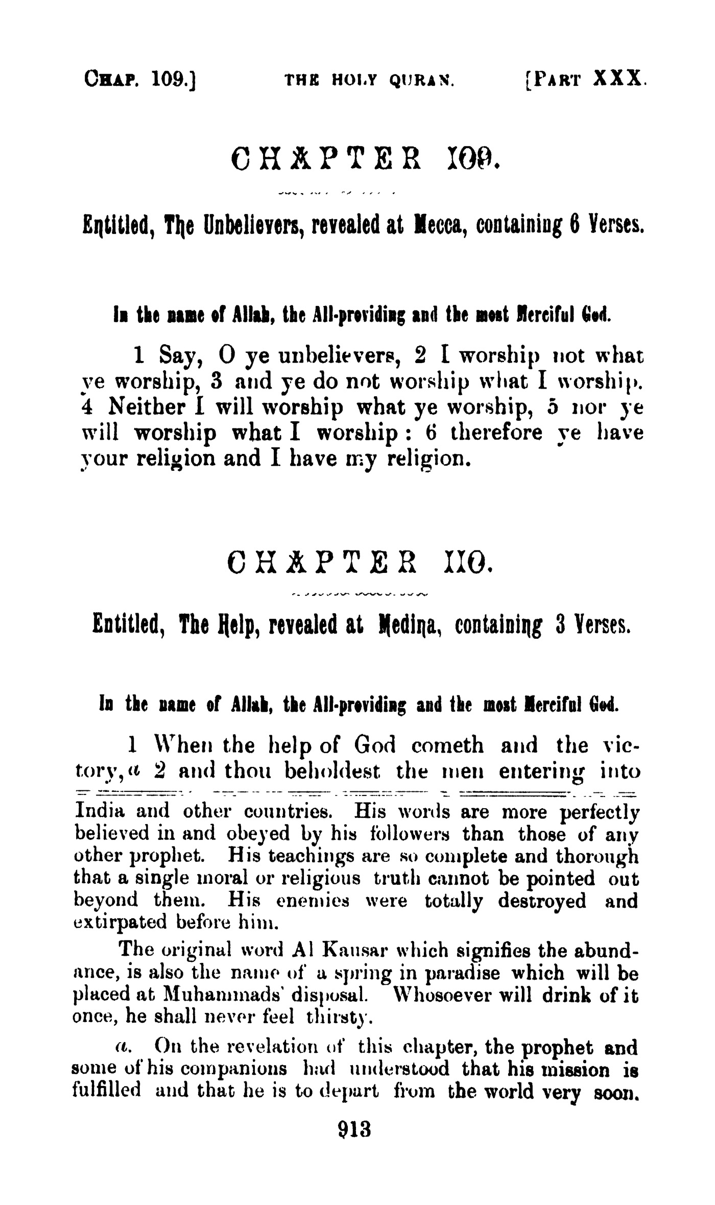 Mohammad Khan, The Holy Qurán. With Short Notes. Based on the Holy Quran, or the Authentic Traditions of the Prophet, or the Old and New Testaments or Scientifics Truths. All fictitious romance, questionable history, and disputed theories have been carefully avoided (1905)