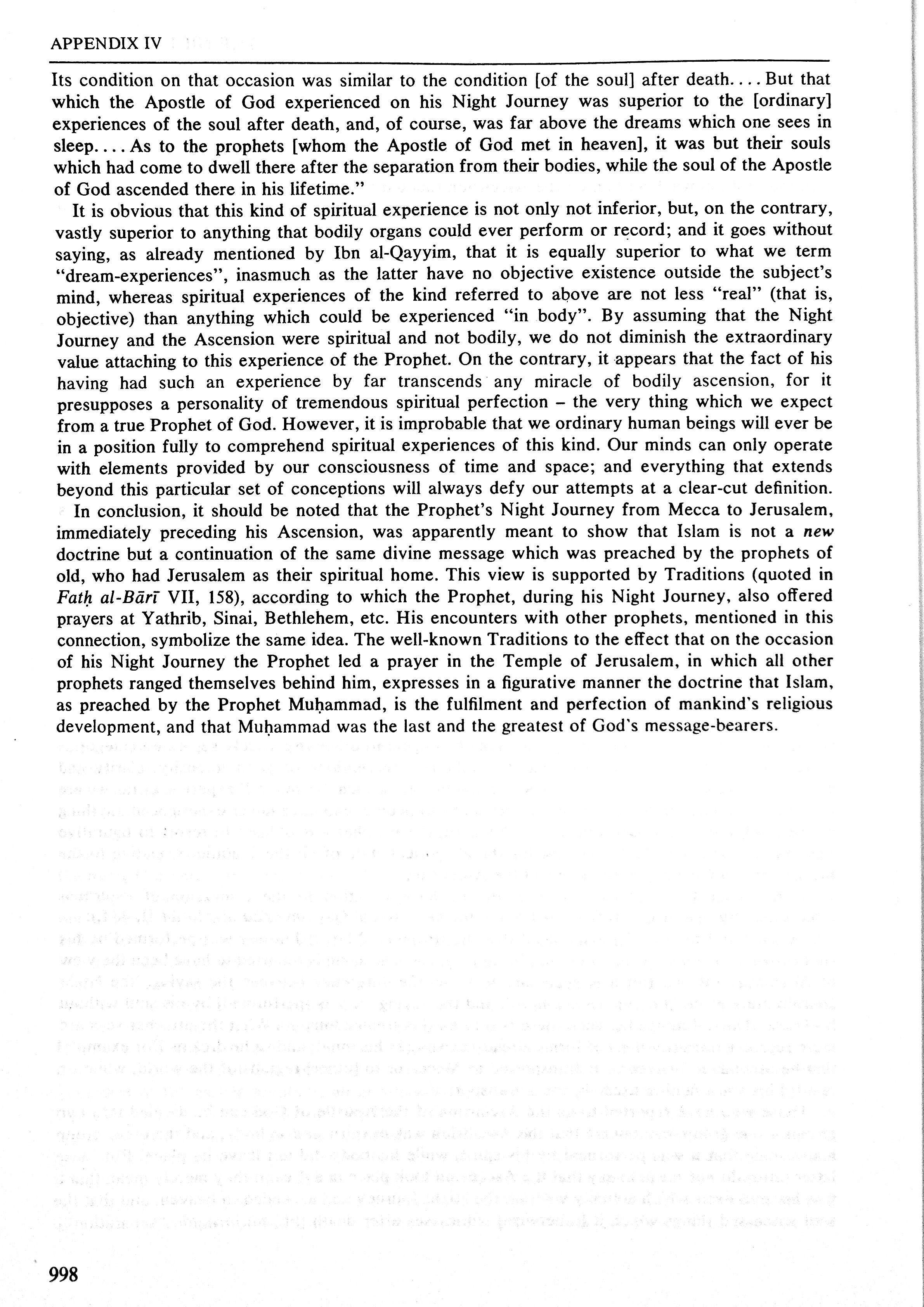 It is obvious that this kind of spiritual experience is not only not inferior, but, on the contrary, vastly superior to anything that bodily organs could ever perform or record; and it goes without saying, as already mentioned by Ibn al-Qayyim, that it is equally superior to what we term “dream-experiences”, inasmuch as the latter have no objective existence outside the subject’s mind, whereas spiritual experiences of the kind referred to above are not less “real” (that is, objective) than anything which could be experienced “in body”. By assuming that the Night Journey and the Ascension were spiritual and not bodily, we do not diminish the extraordinary value attaching to this experience of the Prophet. On the contrary, it appears that the fact of his having had such an experience by far transcends any miracle of bodily ascension, for it presupposes a personality of tremendous spiritual perfection - the very thing which we expect from a true Prophet of God. However, it is improbable that we ordinary human beings will ever be in a position fully to comprehend spiritual experiences of this kind. Our minds can only operate with elements provided by our consciousness of time and space; and everything that extends beyond this particular set of conceptions will always defy our attempts at a clear-cut definition.