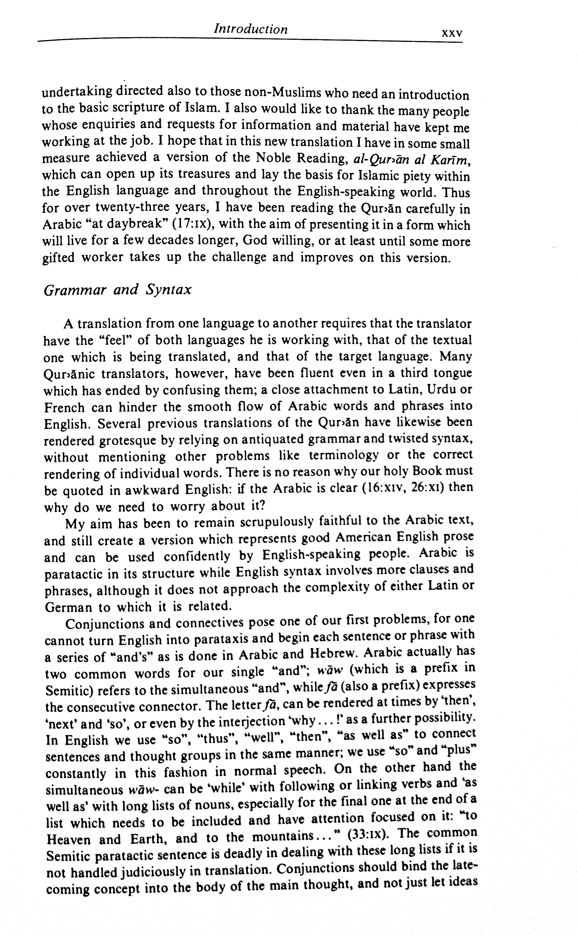My aim has been to remain scrupulously faithful to the Arabic text, and still create a version which represents good American English prose and can be used confidently by English-speaking people. Arabic is paratactic in its structure while English syntax involves more clauses and phrases, although it does not approach the complexity of either Latin or German to which it is related.