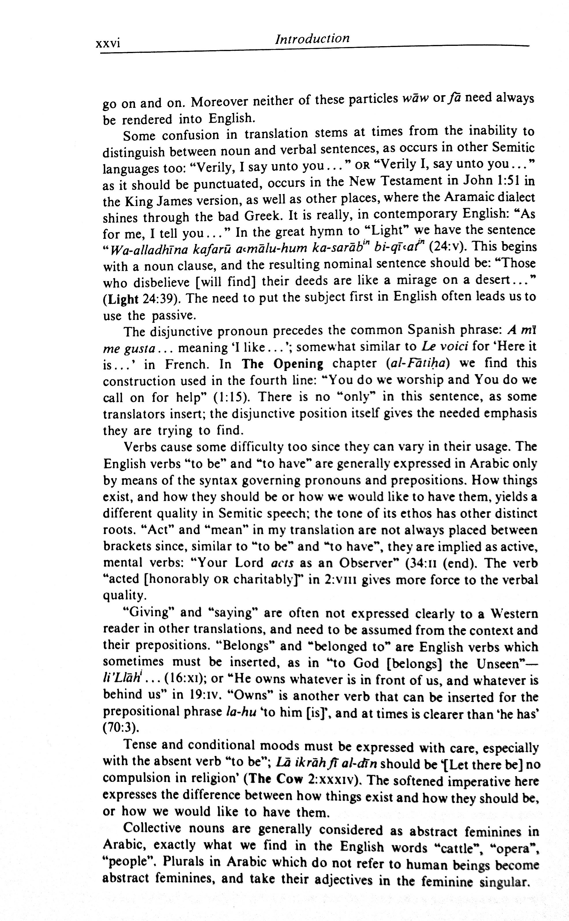 Verbs cause some difficulty too since they can vary in their usage. The English verbs “to be” and “to have" are generally expressed in Arabic only by means of the syntax governing pronouns and prepositions. How things exist, and how they should be or how we would like to have them, yields a different quality in Semitic speech; the tone of its ethos has other distinct roots. “Act” and “mean” in my translation are not always placed between brackets since, similar to “to be" and “to have", they are implied as active, mental verbs: “Your Lord acts as an Observer” (34:ii (end). The verb “acted [honorably or charitably]” in 2:viii gives more force to the verbal quality.