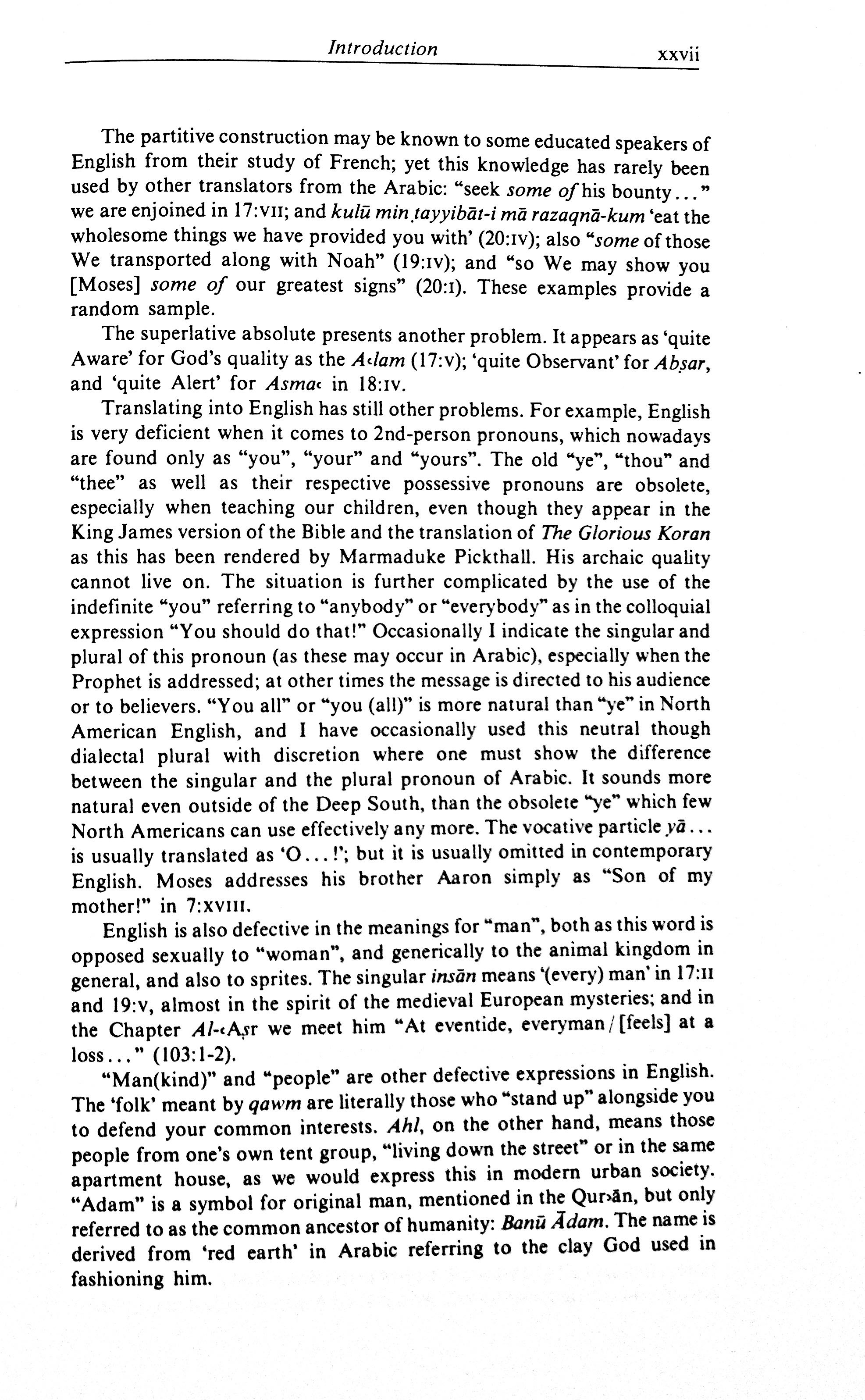 The partitive construction may be known to some educated speakers of English from their study of French; yet this knowledge has rarely been used by other translators from the Arabic: “seek some of his bounty…” we are enjoined in 17:vii; and kulū min ṭayyibāt-i mā razaqriā-kum ‘eat the wholesome things we have provided you with’ (20:iv); also “some of those We transported along with Noah” (19:iv); and “so We may show you [Moses] some of our greatest signs” (20:i). These examples provide a random sample.
