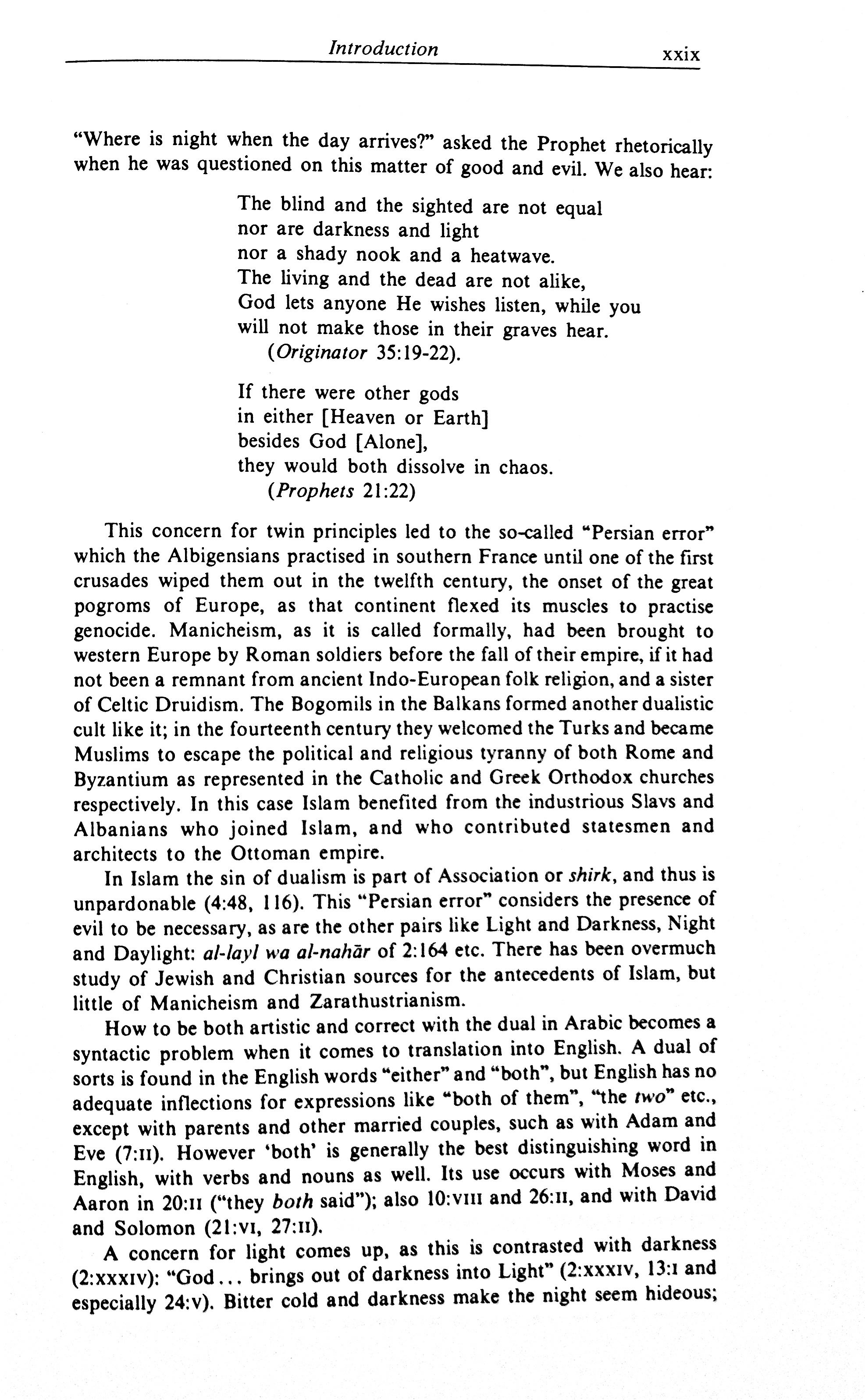 In Islam the sin of dualism is part of Association or shirk, and thus is unpardonable (4:48, 116). This “Persian error” considers the presence of evil to be necessary, as are the other pairs like Light and Darkness, Night and Daylight: al-layl wa al-nahār of 2:164 etc. There has been overmuch study of Jewish and Christian sources for the antecedents of Islam, but little of Manicheism and Zarathustrianism.