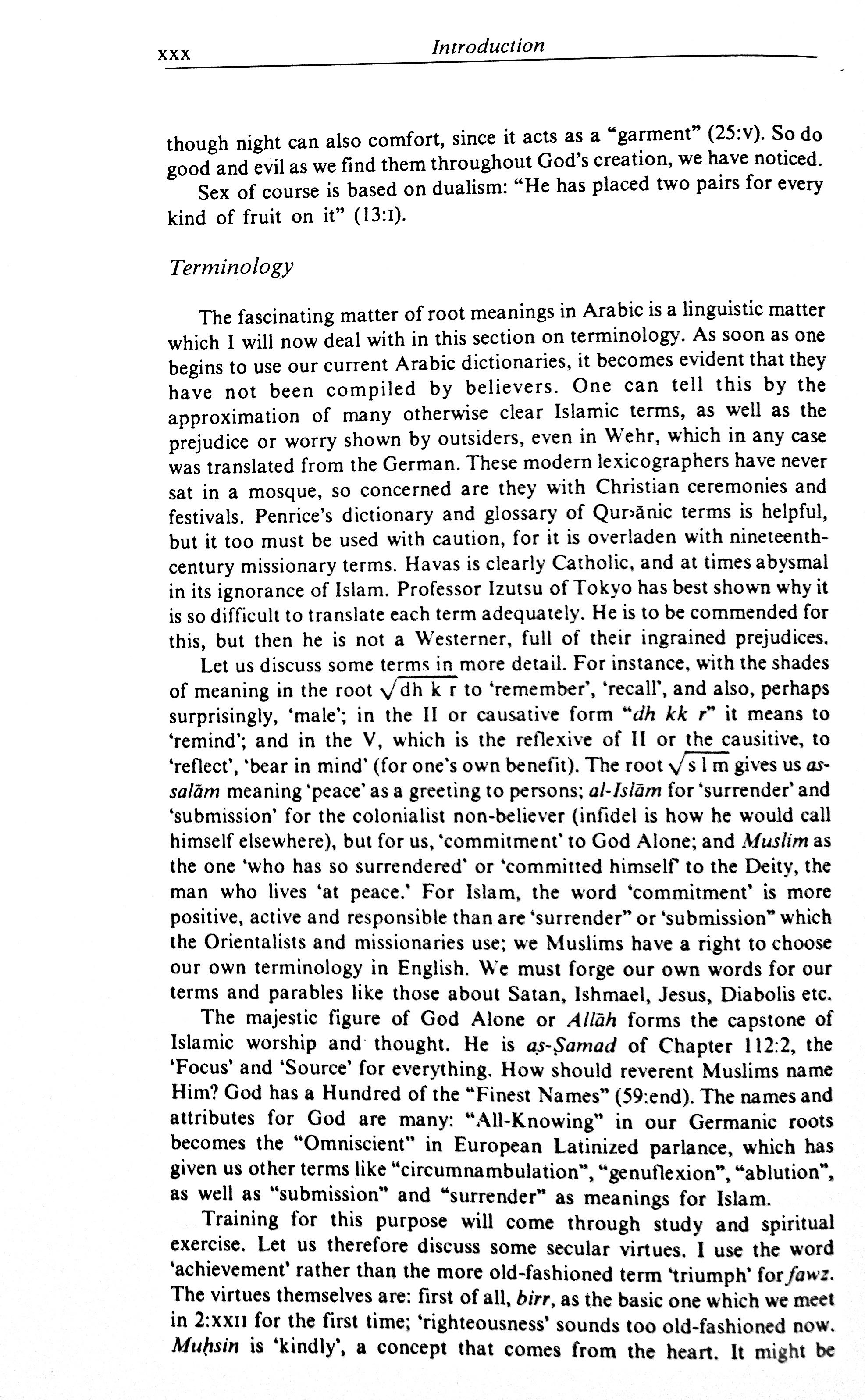 The fascinating matter of root meanings in Arabic is a linguistic matter which I will now deal with in this section on terminology. As soon as one begins to use our current Arabic dictionaries, it becomes evident that they have not been compiled by believers. One can tell this by the approximation of many otherwise clear Islamic terms, as well as the prejudice or worry shown by outsiders, even in Wehr, which in any case was translated from the German. These modern lexicographers have never sat in a mosque, so concerned are they with Christian ceremonies and festivals. Penrice’s dictionary and glossary of Qurʾānic terms is helpful, but it too must be used with caution, for it is overladen with nineteenth-century missionary terms. Havas is clearly Catholic, and at times abysmal in its ignorance of Islam. Professor Izutsu of Tokyo has best shown why it is so difficult to translate each term adequately. He is to be commended for this, but then he is not a Westerner, full of their ingrained prejudices.