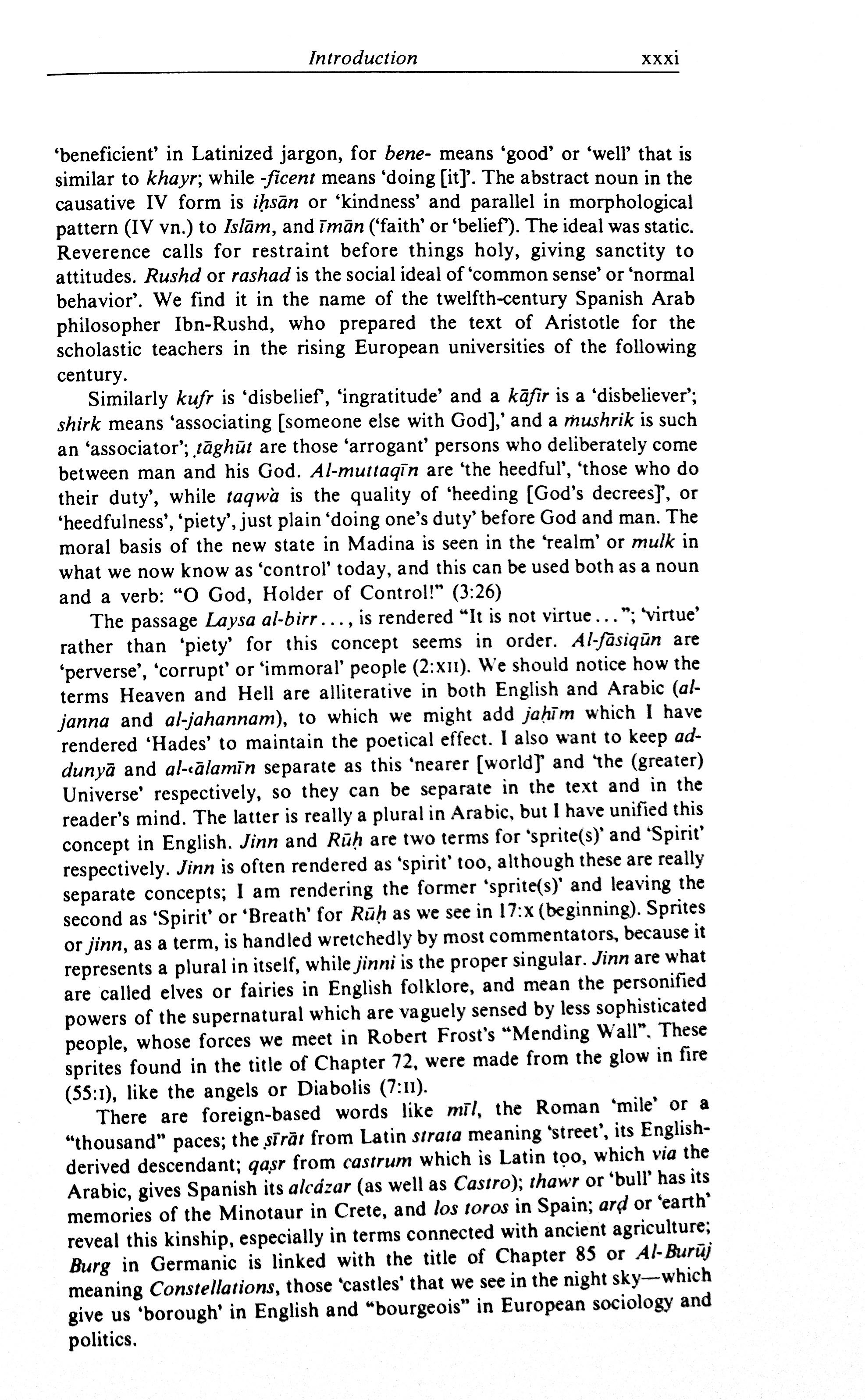 The passage Laysa al-birr…, is rendered “It is not virtue…”; ‘virtue’ rather than ‘piety’ for this concept seems in order. Al-fāsiqūn are ‘perverse’, ‘corrupt’ or ‘immoral’ people (2:xii). We should notice how the terms Heaven and Hell are alliterative in both English and Arabic (al-janna and al-jahannam), to which we might add jaḥīm which I have rendered ‘Hades’ to maintain the poetical effect. I also want to keep ad-dunyā and al-ʿālamīn separate as this ‘nearer [worlds]’ and ‘the (greater) Universe’ respectively, so they can be separate in the text and in the reader’s mind. The latter is really a plural in Arabic, but I have unified this concept in English. Jinn and Rūḥ are two terms for ’sprite(s)’ and ‘Spirit’ respectively. Jinn is often rendered as ‘spirit’ too, although these are really separate concepts; I am rendering the former ‘sprite(s)’ and leaving the second as ‘Spirit’ or ‘Breath’ for Rūḥ as we see in 17:x (beginning). Sprites or jinn, as a term, is handled wretchedly by most commentators, because it represents a plural in itself, while jinni is the proper singular. Jinn are what are called elves or fairies in English folklore, and mean the personified powers of the supernatural which are vaguely sensed by less sophisticated people, whose forces we meet in Robert Frost’s “Mending Wall”. These sprites found in the title of Chapter 72, were made from the glow in fire (55:i), like the angels or Diabolis (7:ii).