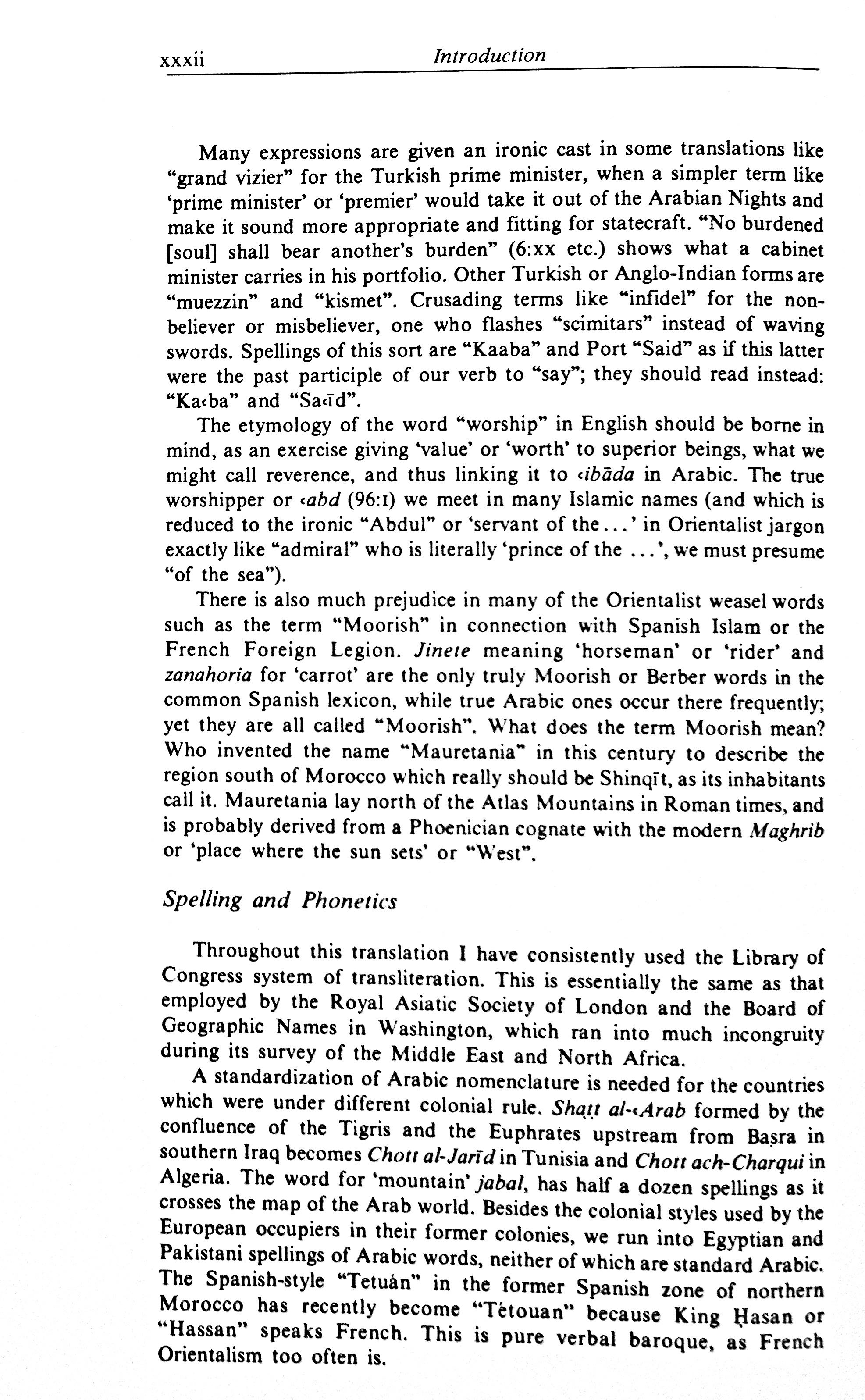 Many expressions are given an ironic cast in some translations like “grand vizier” for the Turkish prime minister, when a simpler term like ‘prime minister’ or ‘premier’ would take it out of the Arabian Nights and make it sound more appropriate and fitting for statecraft. “No burdened [soul] shall bear another’s burden” (6:xx etc.) shows what a cabinet minister carries in his portfolio. Other Turkish or Anglo-Indian forms are “muezzin” and “kismet”. Crusading terms like “infidel” for the non-believer or misbeliever, one who flashes “scimitars” instead of waving swords. Spellings of this sort are “Kaaba” and Port “Said” as if this latter were the past participle of our verb to “say”; they should read instead: “Kaʿba” and “Saʿīd”.